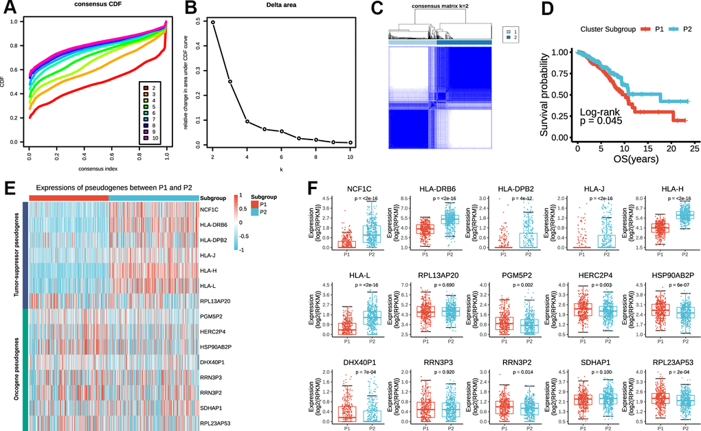 Considering the large amounts of prognostic pseudogenes, we adopted dimensionality reduction analysis through consensus clustering of the 15 prognostic pseudogenes in the subsequent analysis. According to the expression similarity of pseudogenes, k = 2 seemed to be the optimal selection when clustering stability increased from k = 2 to 10 in the TCGA dataset (Figure 3A–3C). Therefore, we divided the 775 breast cancer patients into two subgroups by making 2 as the k value, namely, P1 (Patients subgroup 1) and P2 (Patients subgroup 2). Kaplan-Meier analysis revealed that patients in P2 subgroup had significantly longer overall survival than those in P1 subgroup (median overall survival 17.69 years vs. 10.24 years, log-rank test, p = 0.045, Figure 3D). The expression pattern of the 15 prognostic pseudogenes across P1 and P2 subgroups was displayed in Figure 3E. Results indicated that P1 subgroup had lower expressions of tumor-suppressor pseudogenes and higher expressions of oncogene pseudogenes, while P2 subgroup showed the opposite trends. What’s more, compared with P1, P2 subgroup had significantly higher expressions of 6 tumor-suppressor pseudogenes (NCF1C, p < 2e-16; HLA-DRB6, p < 2e-16; HLA-DPB2, p = 4e-12; HLA-J, p < 2e-16; HLA-H, p < 2e-16; HLA-L, p < 2e-16), and significantly lower expressions of 6 oncogene pseudogenes (PGM5P2, p = 0.002; HERC2P4, p = 0.003; HSP90AB2P, p = 6e-07; DHX40P1, p = 7e-04; RRN3P2, p = 0.014; RPL23AP53, p = 2e-04) (Figure 3F). In addition, we found that the P1 and P2 subgroup were also significantly associated with the clinicopathological features. P2 subgroup was significantly associated with ER status (p = 0.028), more basal-like molecular subtype (p = 0.002) and lower lymph node stage (p = 0.047) compared with P1 (Supplementary Table 3). These findings were highly consistent with those of the risk score mentioned above, which indicated that the expression pattern of prognostic pseudogenes was significantly associated with tumor survival.