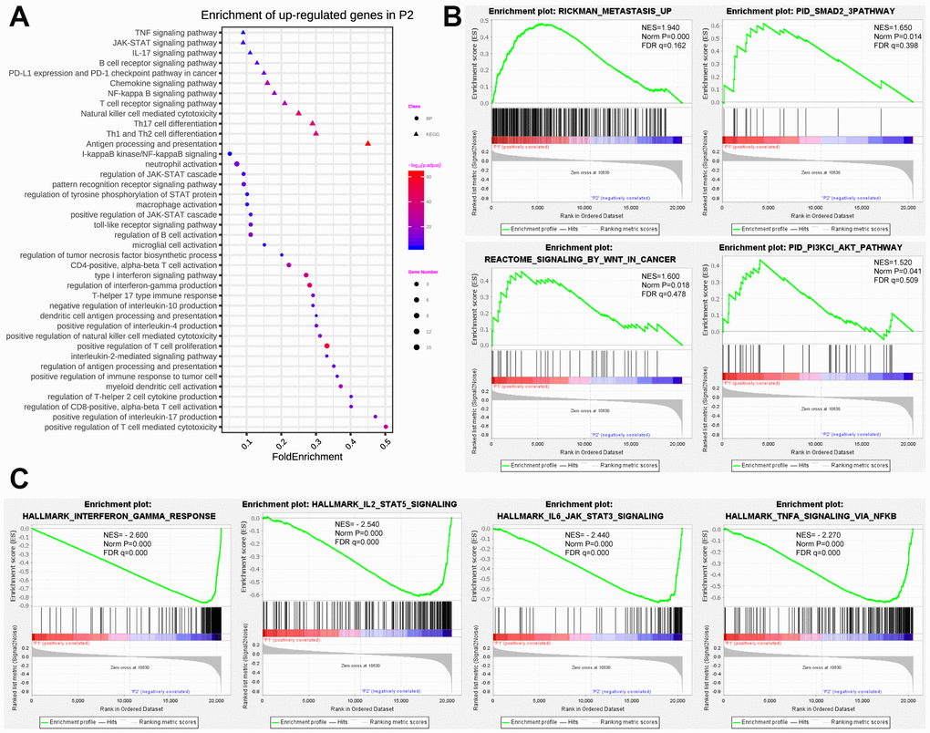 To better illuminate the association between prognostic pseudogenes and malignancy of breast cancer, we identified the differentially expressed genes between P1 and P2 subgroups and annotated their functions using GO, KEGG pathway analysis and GSEA. GO pathway analyses revealed that upregulated genes in P2 were significantly enriched in tumor-related biological processes and pathways (Figure 4A), including regulation of JAK-STAT cascade, pattern recognition receptor signaling pathway and type I interferon signaling pathway. KEGG pathway analysis indicated that upregulated genes in P2 were enriched in TNF, JAK-STAT, IL-17, B cell receptor, Chemokine, NF-kappa B, T cell receptor signaling pathway and PD-L1expression and PD-1 checkpoint pathway in cancer (Figure 4A). Furthermore, “METASTASIS”, “SMAD”, “SIGNALING_BY_WNT_IN_CANCER” and “PI3KCI_AKT” were strikingly enriched in P1 subgroup indicating by GSEA (Figure 4B), while the hallmarks of “INTERFERON GAMMA RESPONSE”, “IL2 STAT5 SIGNALING”, “IL6 JAK STAT3 SIGNALING”, and “TNF SIGNALING” were remarkably enriched in P2 subgroup (Figure 4C). All these results partially clarified the mechanism underlying the prognostic effect of pseudogenes in breast cancer.