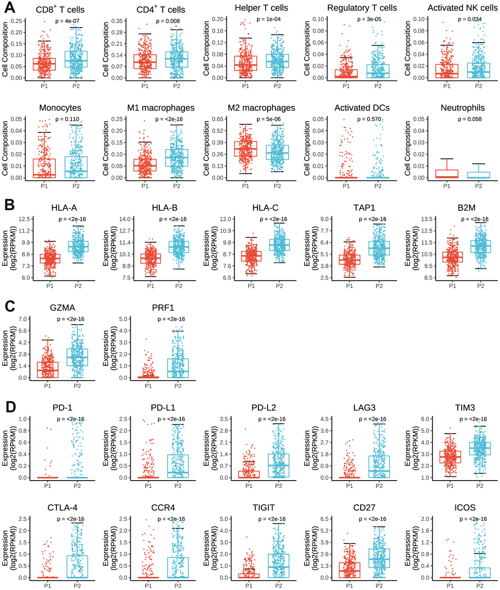 CIBERSORT [33], a bioinformatic deconvolution algorithm to calculate immune cell composition from their gene expression profiles, was used to assess tumor-infiltrating cell compositions in diverse tumors [42]. The immune cell fractions, expressions of antigen presenting genes, immunomodulator genes [43] and immune cytolysis genes [44] were compared in different subgroups by Wilcoxon signed-rank test.