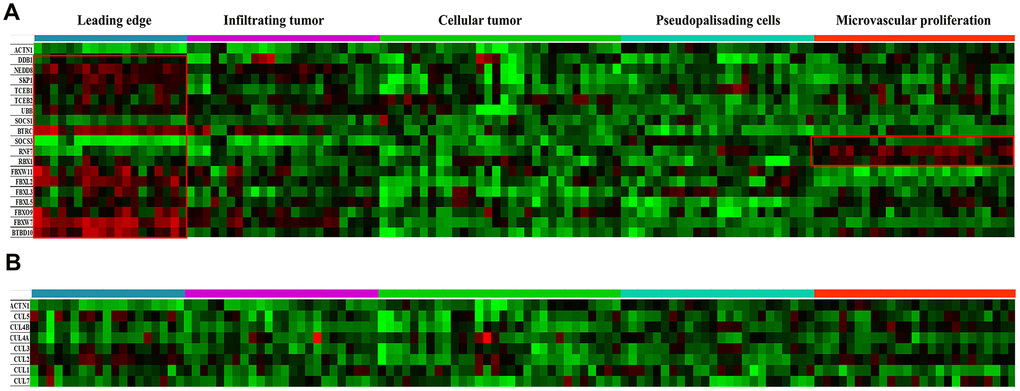 The Ivy GAP dataset has a 41-patient cohort whose tumor samples were evaluated based on anatomic features classified as leading edge (LE), infiltrating tumor (IT), cellular tumor (CT), pseudopalisading cells around necrosis (PAN) and microvascular proliferation (MVP). Classification of these anatomic features was carried out using hematoxylin and eosin (H&E) staining. Genes encoding major CRLs components including SKP1, BTBD10, DDB1, TCEB1, TCEB2, BTRC, SOCS1, SOCS3, FBXL2/3/5, FBXW7/11, FBXO9, RBX1, RNF7, UBB, NEDD8, CUL1, CUL2, CUL3, CUL4A, CUL4B, CUL5 and CUL7 were included. ACTN1 gene expression was used as a reference. In situ hybridization (ISH) for CUL5 and SOCS3 were also derived from the Ivy GAP dataset.