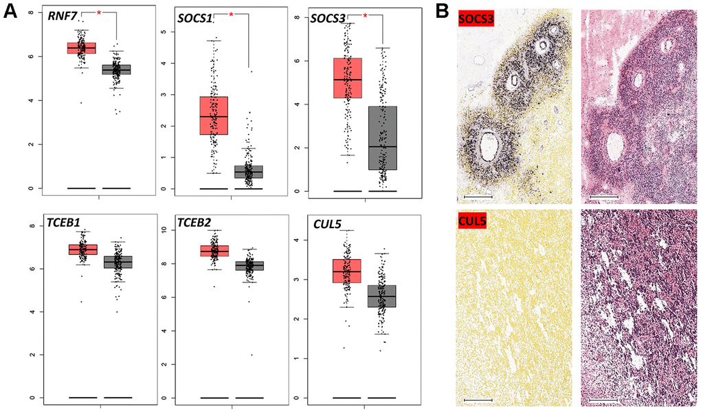 CRL5-independent activities of SOCS3 involve mitogen-activated protein kinase (MAPK) pathway activation, as well as JAK-signal transducer and activator of transcription (STAT) pathway inhibition [29, 30]. Our gene expression heatmap analysis showed that SOCS3 expression levels correlate poorly with those of RNF7, TCEB1 and TCEB2 in GBM samples. Also, SOCS3 expression was clustered around capillaries, whereas CUL5 expression was evenly distributed (Figures 2A and 3B). This pattern of distribution is consistent with previous studies suggesting the upregulation of SOCS3 transcription levels in areas with higher O2 saturation [29].