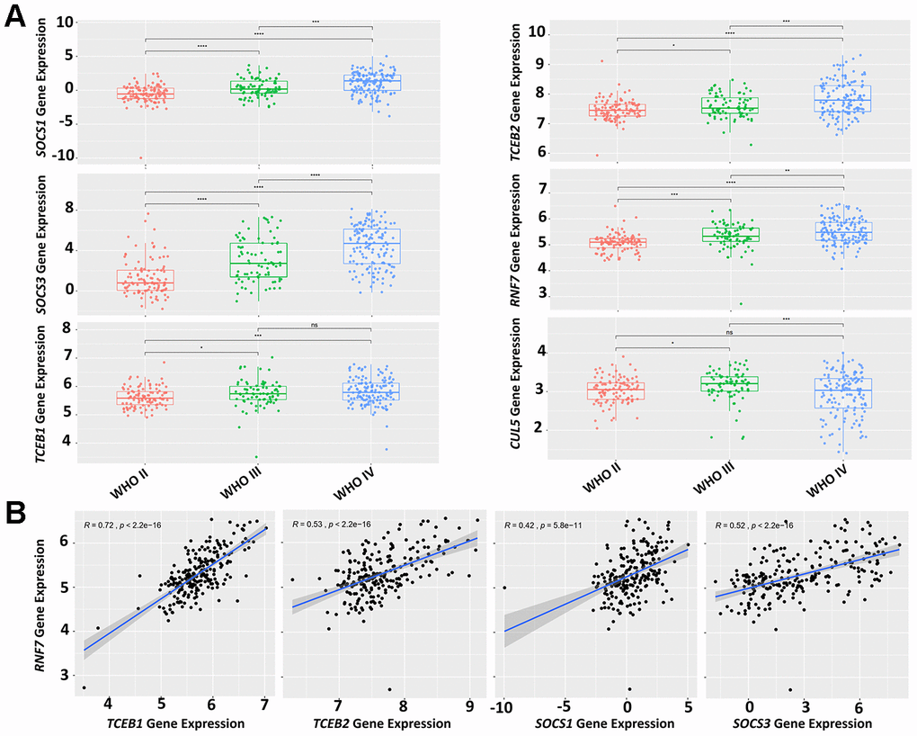The WHO classification offers primary guidelines for brain tumor grading and treatment. However, the grading system for glioma largely depends on microscopic histological features, because molecular biomarkers are not available [18]. We determined if the expression of CRL5 components was correlated with WHO tumor classification. In the Chinese Glioma Genome Atlas (CGGA) dataset, we found that elevated expression levels of SOCS1, SOCS3, TCEB1, TCEB2 and RNF7 correlated with more advanced WHO grades (grades III and IV) of primary glioma (Figure 4A). The expression levels of CUL5 did not correlate with glioma WHO grades (Figure 4A). We further studied whether the SOCS1, SOCS3, Rbx2, Elongin B and Elongin C proteins form a functional complex. We found that the expression levels of RNF7 correlate with those of TCEB1 and TCEB2, SOCS1, SOCS3, with R values of 0.72, 0.53, 0.42 and 0.52, respectively (Figure 4B). These results indicate that components of CRL5 form a functional protein complex in GBM, and their gene expression levels can be valuable grading biomarkers.