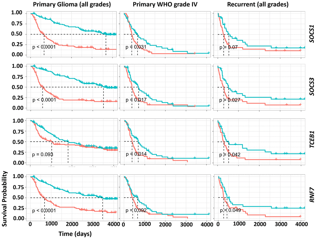 K-M survival analyses for primary glioma of all grades, World Health Organization (WHO) grade IV and recurrent glioma were derived from the CGGA data (mRNAseq_325). Cohorts with sample sizes of 224, 85 and 57 were included for overall survival (OS) analysis of primary, WHO grade IV and recurrent gliomas. Median expression levels of the SOCS1, SOCS3, RNF7, TCEB1 and TCEB2 genes were used as cutoffs for classification of patients with lower-than-median and higher-than-median expression levels in each group of analysis. A log-rank test was used for calculations of P values.