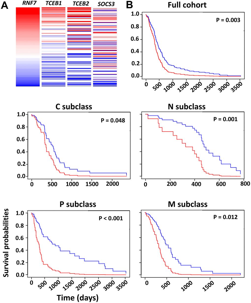 Glioma patients harboring an IDHs mutation and 1p/19q co-deletion often have favorable clinical outcomes [19]. Both SOCS1 and SOCS3 in the CRL5 function as substrate-binding proteins that recruit target proteins for Ub conjugation. Due to low basal expression levels of SOCS1 in GBM and the gene’s potential functional overlap with SOCS3, we decided to exclude SOCS1 in our multi-gene analysis for GBM prognosis. SOCS3, RNF7, TCEB1 and TCEB2 are genes encoding key components of the CRL5 complex. These genes were first analyzed on the UCSC Xena tool using an RNA-seq dataset of 172 The Cancer Genome Atlas Glioblastoma Multiforme (TCGA-GBM) patients (https://xena.ucsc.edu/) (Figure 6A). The heatmap analysis confirmed a linear correlation between the selected genes, and a Cox model was warranted to calculate the PI, also known as the risk score (Figure 6A). Verhaak et al. classified GBM into the following four types: classical, mesenchymal, proneural and neural (C, M, P, N) [20]. Using O-6-methylguanine-DNA methyltransferase (MGMT) gene methylation status as a covariate, we evaluated the PI for the four-gene RNA-seq signature in all GBM subclasses of a GBM-BioDP dataset. We found that the four-gene signature had PI values of 1.61, 1.86, 2.71, 3.66 and 3.45 for the full GBM cohort, and the C, M, P and N subclasses, respectively (Figure 6B). Hazard ratio (HR)-based P-value analysis yielded P values of 0.003, 0.048, 0.001, < 0.001 and 0.012 for the full GBM cohort, and the C, M, P and N subclasses, respectively (Figure 6B). These data indicate that the four-gene signature encoding the CRL5 components Elongin B, Elongin C, SOCS3 and Rbx2 can predict the OS of all the GBM subclasses.