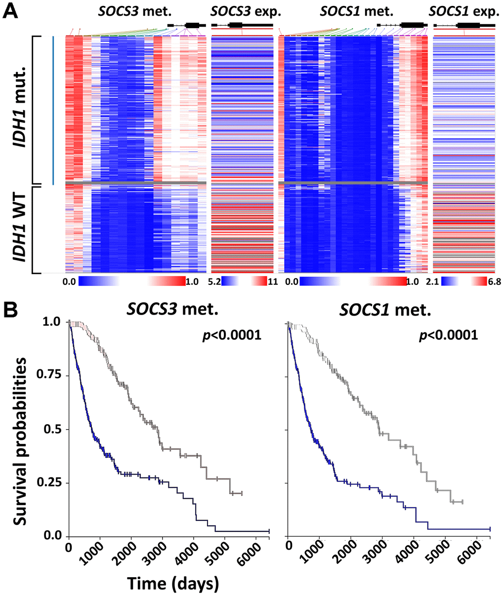 We demonstrated that elevated expression levels of either SOCS1 or SOCS3 could independently predict poor prognosis of patients with primary glioma or GBM. Recent studies have found that SOCS1 and SOCS3 genes are hypermethylated in various types of cancers [21, 22]. We conducted a heatmap analysis of a cohort of 658 patients in TCGA Low-Grade Glioma and GBM (TCGA-LGG/GBM) dataset (Figure 7A). We found that IDH1 mutation predicts hypermethylation and expression downregulation of SOCS1 and SOCS3 (Figure 7A). Furthermore, patients with hypermethylation of either SOCS1 or SOCS3 have favorable OS rates regardless of treatment regimens (Figure 7B). To study the potential correlation between IDH1 mutation status and SOCS1/SOCS3 expression levels, we identified 7 patients carrying missense/in-frame IDH1 mutations whose SOCS3 expression levels were also available in the TCGA-GBM dataset. All 7 patients with mutated IDH1 had lower-than-median SOCS3 expression levels and promoter hyperme thylation (Supplementary Figure 1). We found that SOCS1 expression levels are not closely related to methylation status in TCGA-GBM dataset (data not shown). Together these data indicate that IDH1 mutations may cause SOCS1 and SOCS3 hyperme thylation and expression downregulation.