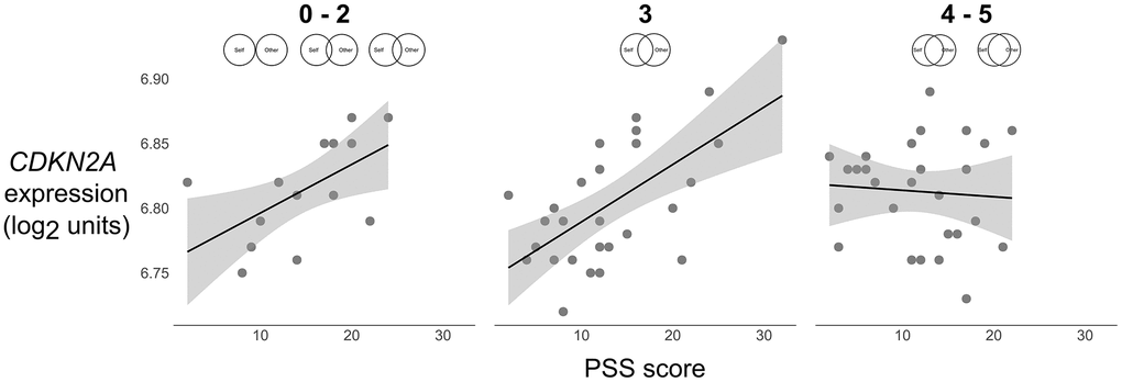 An unadjusted random intercept model examined accumulated daily stress, relationship closeness, and their interaction as predictors of CDKN2A expression, followed by an adjusted model that accounted for age, sex, and ethnicity/race (Supplementary Table 2). Contrary to expectations, the interaction between accumulated daily stress and relationship closeness on CDKN2A expression was not significant in either model.