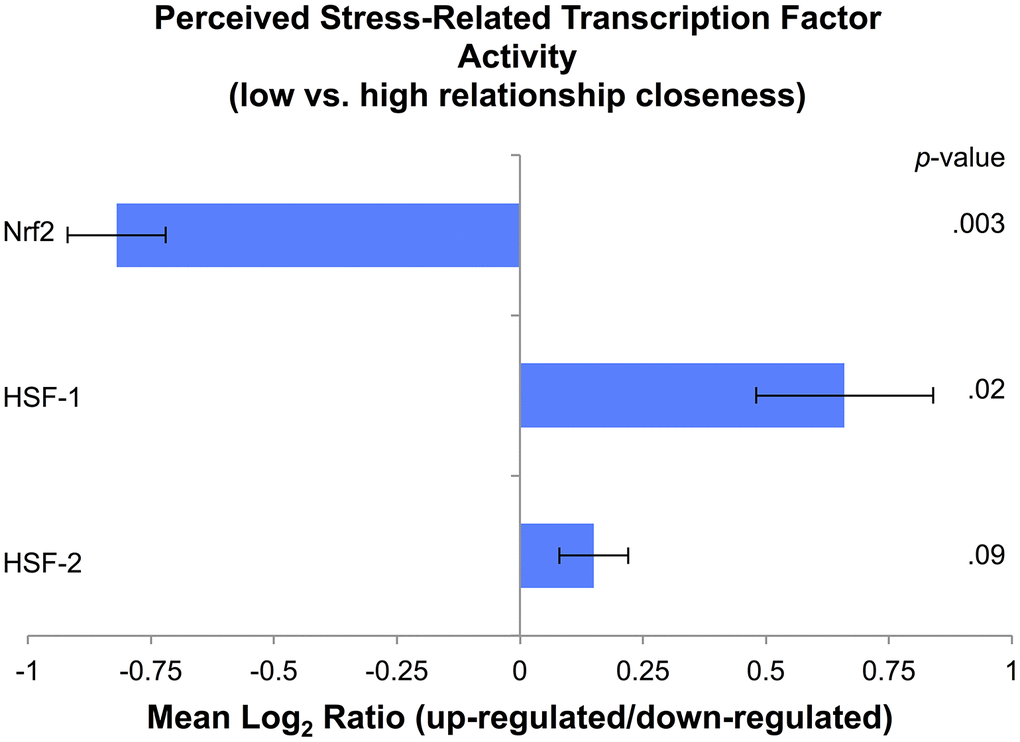 Secondary bioinformatics analyses revealed that, relative to parents who experienced greater closeness with their spouses, those with less closeness showed reduced stress-related Nrf2 representation. Nrf2 is considered a key TF for protecting the cell against oxidative stress, as it regulates genes that encode detoxifying enzymes and antioxidant proteins [7]. In addition, relative to parents who experienced greater closeness, those with less closeness showed greater stress-related HSF-1 representation and marginally greater HSF-2 representation. Previous research has found that HSFs regulate genes that encode heat shock proteins, which aid in the synthesis, transport, and folding of proteins under conditions of stress [8]. This pattern of findings suggests that parents with low closeness may show a reduced antioxidant response under conditions of oxidative stress that could contribute to accumulated cellular damage and lead to cellular senescence, whereas parents with high closeness show a robust anti-oxidant response that could protect against cellular damage. Although these cross-sectional data cannot address whether Nrf2 and HSF activation are a direct compensatory response to cell stress, or whether they are activated simultaneously or sequentially, findings suggest plausible associations with these mechanisms that warrant investigation in future research.