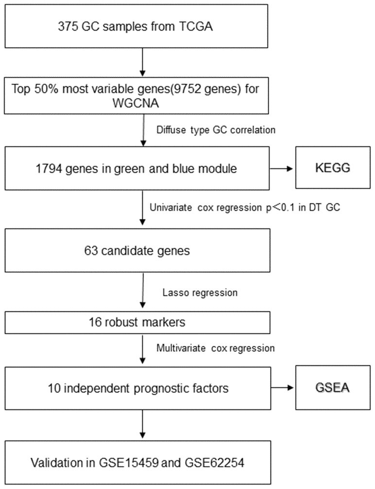 WGCNA, the algorithm aiming to investigate the relationships between genes and phenotype of samples, can be applied to identify complex biological mechanisms responsible for the target phenotypes. The unsupervised hierarchical clustering method selected by WGCNA avoided potential biases and subjective decisions attributed to the selection of the candidate genes previously reported associated with diffuse type GC. We applied a system biology approach, namely WGCNA, to analyze TPM expression dataset to identify the networks and genes associated with diffuse type GC. The lasso regression algorithm as the precision and efficiency of variable selection reduced the dimension of model and cox regression algorithm was performed to identify 10 prognostic genes model. The C-index, AUCs and survival difference of high- and low- risk groups well demonstrated perfect performance of predicting survival of model in diffuse type GC. And the similar phenomenon was observed in the independent cohort of GSE15459 and GSE62254.