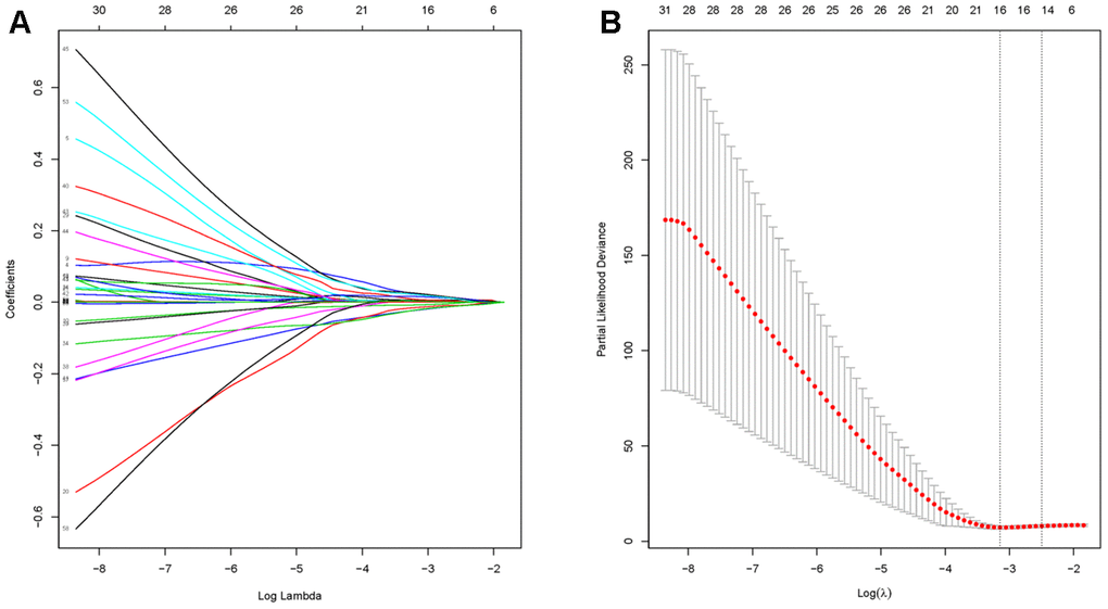 Before conducting the univariate cox analysis, we first adopted the merge function in R to integrate the expression profiles of the 1794 module genes with corresponding 71 diffuse type GC patients’ survival time and status information. 63 overall survival (OS)-related hub genes (p<0.1) were picked out by univariate cox regression analysis. According to the characteristics of variable selection and regularization, while fitting the generalized linear model, LASSO regression was performed to select hub genes for predicting the prognosis of high-performance patients (Figure 3A, 3B). This approach is popular in machine learning and is implemented through the “glmnet” package. 16 hub genes ("RALA", "DDX3Y", "ERP29", "SRSF5", "SLC9A3R1", "FBXO9", "GMDS", "CCNI", "LEF1", "RFX5", "CAST", "ELMO1", "FRZB", "TMEM92", "SELP" and "NMB") were identified.