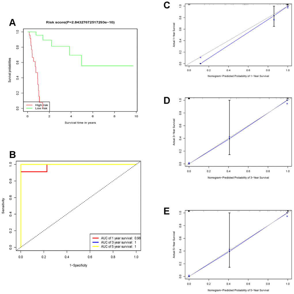 First, followed by multivariate cox regression, the optimal 10 prognostic signatures in diffuse type GC samples (Table 1), including: “RALA”, “DDX3Y”, “SRSF5”, “SLC9A3R1”, “GMDS”, “LEF1”, “RFX5”, “CAST”, “FRZB” and “SELP”, were picked out. Then, the risk score (RS) model for OS was identified. All 71 diffuse type GC samples were endowed with a RS by RS model calculation and divided into high- and low- RS groups using the median value as the cut-off point. The concordance index (C-index) of this model was 0.97, indicating that this model had quite high reliability. Figure 4A showed that patients in the low-risk group had longer OS (p < 2.8e-10) than those of the high-risk group. The relation of high- and low expression of 10 genes to OS were viewed in Supplementary Figures 2–11. To determine the predictive accuracy of this prognostic model, we performed a receiver operating characteristic (ROC) curve analysis, which demonstrated that the area under the curve (AUC) was 0.98 for 1-year survival, 1 for 3-year survival and 1 for 5-year (Figure 4B). And the calibration curve supported the predicting model of 10 genes (Figure 4C–4E). The survival, 10 genes expression and risk score for TCGA samples could be viewed in Supplementary Table 1.