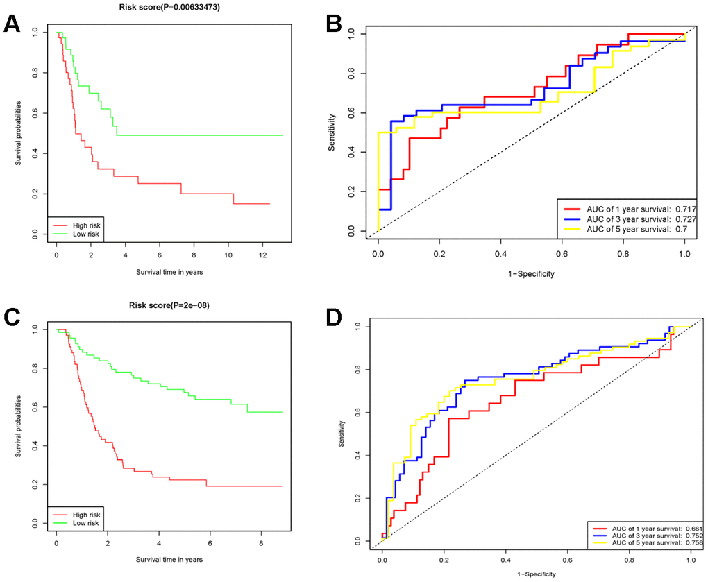 75 diffuse type GC patients from GSE15459 were remaining after removing the non-diffuse type and survival time as zero. Consistent with the results in the TCGA cohort, the low RS group had good performance in OS (P=0.00633473) than in the high RS group (Figure 5A). Moreover, the AUCs for 1-year, 3-year and 5-year survival in the validation cohort were 0.717, 0.727 and 0.7 (Figure 5B), respectively. There were 135 diffuse type GC patients in GSE62254 by the above same processing. The low RS group had good performance in OS (P=2E-8) than the high RS group as same as above (Figure 5C). the AUCs for 1-year, 3-year and 5-year survival in the validation cohort were 0.661, 0.752 and 0.758 (Figure 5D). Thus, the RS model had again been proved to be reliable. The survival, 10 genes expression and risk score for GSE15459 and GSE62254 samples could be viewed in Supplementary Tables 2 and 3.