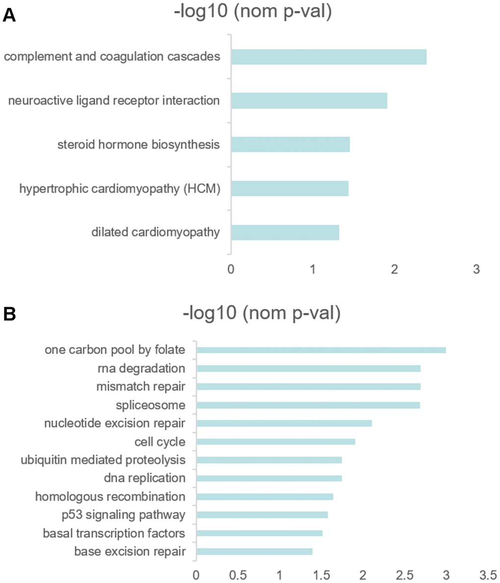 In order to explore the difference of functions and pathways of high- and low- RS groups, the gene set enrichment analysis (GSEA) was performed using the risk score as the reference phenotype. The GSEA analysis revealed that the complement and coagulation cascades, neuroactive ligand-receptor interaction, hypertrophic cardiomyopathy (HCM), steroid hormone biosynthesis and dilated cardiomyopathy were upregulated in the high-risk group (Figure 6A). Then, the spliceosome, one carbon pool by folate, nucleotide excision repair, cell cycle, RNA degradation, mismatch repair, DNA replication, ubiquitin mediated proteolysis, homologous recombination, p53 signaling pathway, basal transcription factors and base excision repair were upregulated in the low-risk group (Figure 6B). To investigate the enrichment pathways of 10 prognostic genes, we divided the samples into two groups, a group samples with the expression of upper quantile for one of 10 prognostic genes and another group samples with the expression of lower quantile for one of 10 prognostic genes. All 10 genes related pathway enrichment could be viewed in Supplementary Table 4.