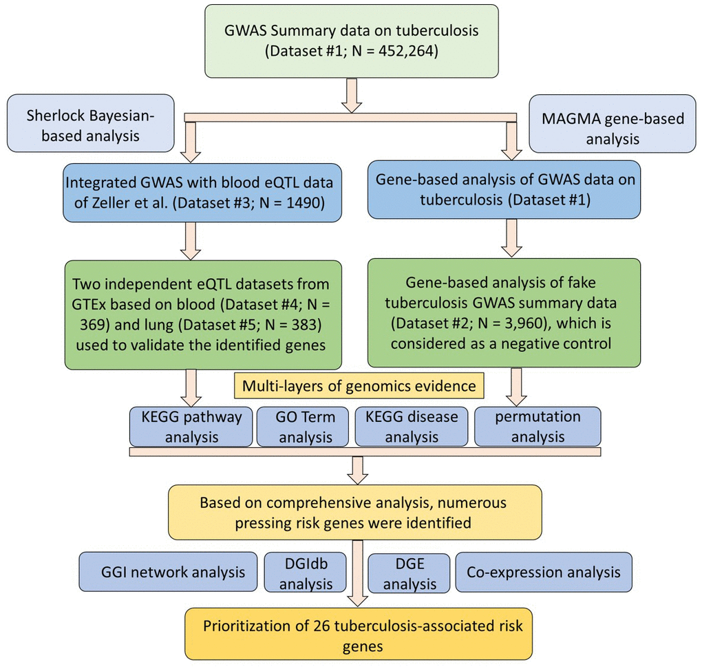 To the best of our knowledge, there was no systematical integrative genomics analysis on TB conducted to reveal the genome-wide regulatory effects of SNPs on gene expression. In the present study, we applied a two-stage designed analysis to identified risk SNPs, genes and pathways for TB. We first used the Sherlock integrative analysis to identify cis- and trans-regulatory effects of SNPs on expression abundance of interested genes via incorporating a large-scale GWAS summary dataset (N = 452,264) with a blood-based eQTL dataset (N = 1,490). Then, using the Sherlock analysis with same parameters, we adopted two independent eQTL datasets based on blood (N = 369) and lung tissue (N = 383) to replicate the results in the discovery stage. Furthermore, we employed a series of bioinformatics analyses including MAGMA analysis, in silico permutation analysis, pathways/diseases-based enrichment analysis, network-based enrichment analysis, DGIdb enrichment analysis, and co-expression analysis based on multi-omics data to highlight TB-associated risk genes with strong evidence.