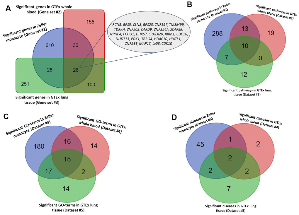 For the functional enrichment analyses of these two gene sets, 40 pathways, 50 GO-terms, and 7 diseases-terms (FDR ≤ 0.05; Supplementary Tables 7–9) were significantly overrepresented by Gene set #2, as well as 29 pathways, 51 GO-terms, and 13 diseases-terms (FDR ≤ 0.05; and Supplementary Tables 10–12) were significantly enriched by Gene set #3. Furthermore, we found 10 common pathways, 18 common GO-terms, and 2 common enriched diseases (FDR ≤ 0.05; Figure 2B–2D, Tables 2, 3, and Supplementary Table 13) were significantly enriched by all the 3 independent gene sets.
