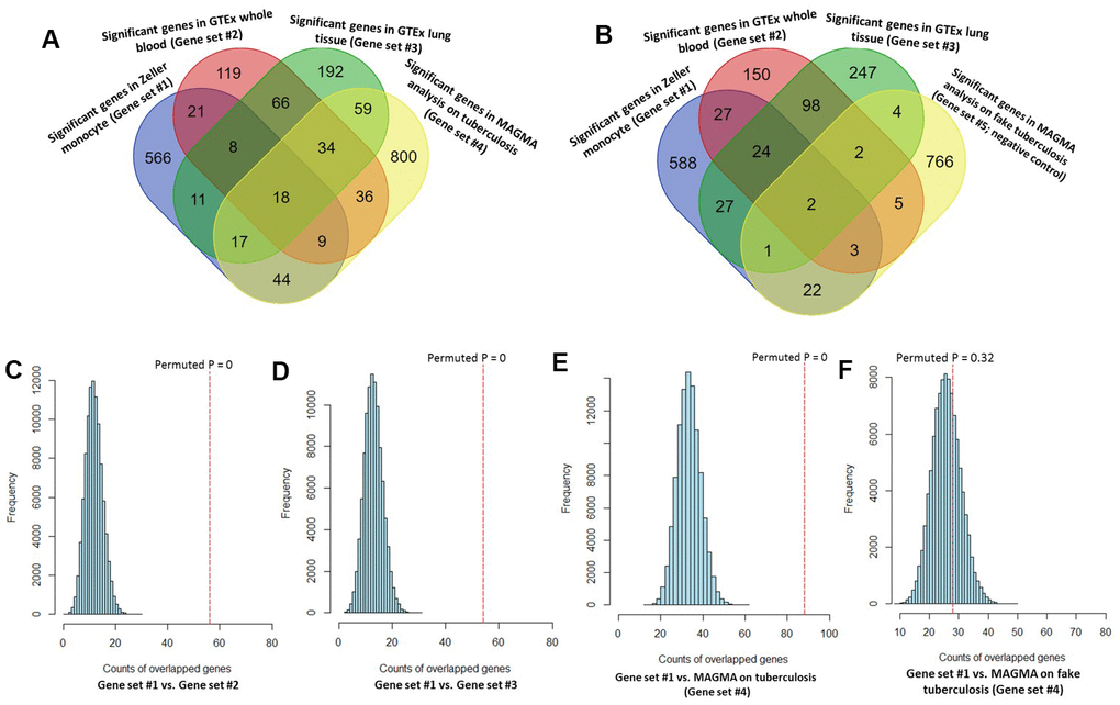 By using the Sherlock Bayesian and MAGMA analysis, 5 gene sets were identified to be associated with TB risk; namely Gene set #1 from discovery stage (Dataset #3), Gene set #2 from replication stage (Dataset #4), Gene set #3 from replication stage (Dataset #5), Gene set #4 from MAGMA analysis on TB (Dataset #1), and Gene set #5 from MAGMA analysis on fake TB (Dataset #2). Based on these 5 gene sets, we carried out serial in silico permutation analyses with 100,000 times of random trial [71]. In first step of this permutation analysis, the number of overlapped genes between Gene set #1 with other gene sets (Nobservation) were counted separately. Second, the background genes of each gene set was treated as a gene pool, which could be used for random selections. The number of background genes (N total) were 5,786, 7,452, 18,318, and 17,565 for Gene sets #2, #3, #4, and #5, respectively. By randomly picking the same number as the significant genes in Gene sets #2, #3, #4, and #5 from background genes (N total) respectively, via 100,000 times of repeat, we calibrated the count of genes overlapped with these significant genes of Gene set #1(Nrandom). Finally, we calculated the number of times Nrandom ≤ Nobservation and divided by 100,000 to obtain an empirical permuted P value. P value less than 0.05 is considered to be of significance. The density plot of each analysis was generated by using the R platform.