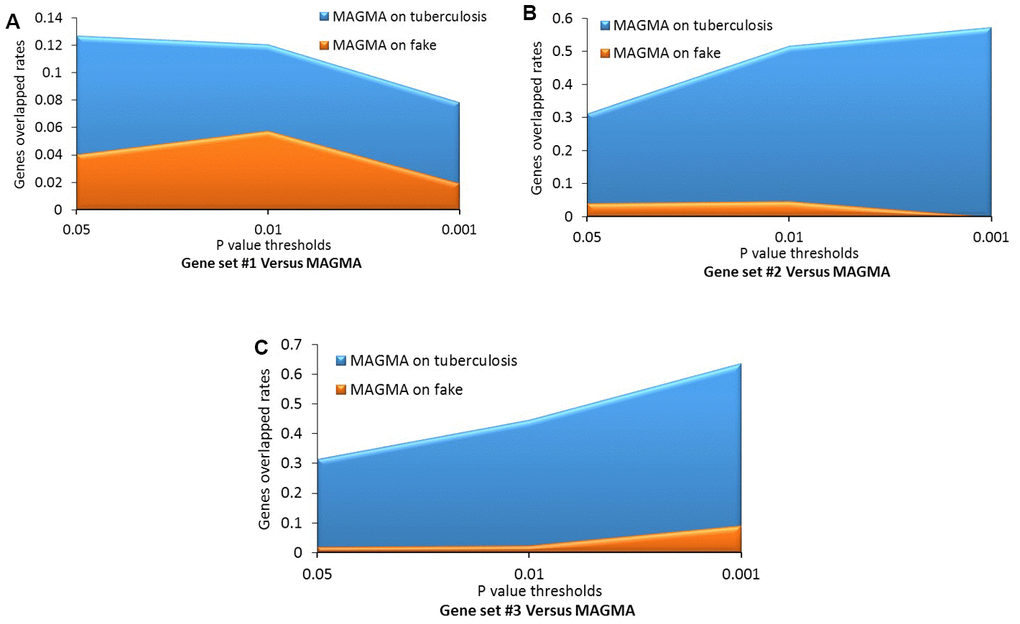 Consistently, by using permutation analyses, genes identified from the discovery stage (Gene set #1) were significantly higher overlapped with identified genes from Gene sets #2, #3, and #4 in the replication stage than that of 100,000 times of random selections (Permuted P = 0, 0, 0 separately; Figure 3C–3E). Furthermore, there was no difference in overlap between genes from Gene set #1 with genes from Gene set #5 and genes from random selections (Permuted P = 0.32; Figure 3F). Additionally, to further determine whether these identified TB-associated genes were due to genetic determinants rather than false discoveries, we compared the results from MAGMA analysis on TB (Gene set #4) and fake TB (Gene set #5) with significant genes identified from 3 times of independent Sherlock analyses (Gene sets #1, #2, and #3) at 3 distinct P value thresholds (i.e., P = 0.05, 0.01, or 0.001), respectively. Consistently, we found that the overlapped gene rates between Sherlock-identified genes and MAGMA-identified genes were remarkably higher than that with MAGMA analysis on fake TB across 3 different thresholds (Figure 4A–4C). Together, these results further confirm that our identified genes are potentially convincing candidate genes for TB.