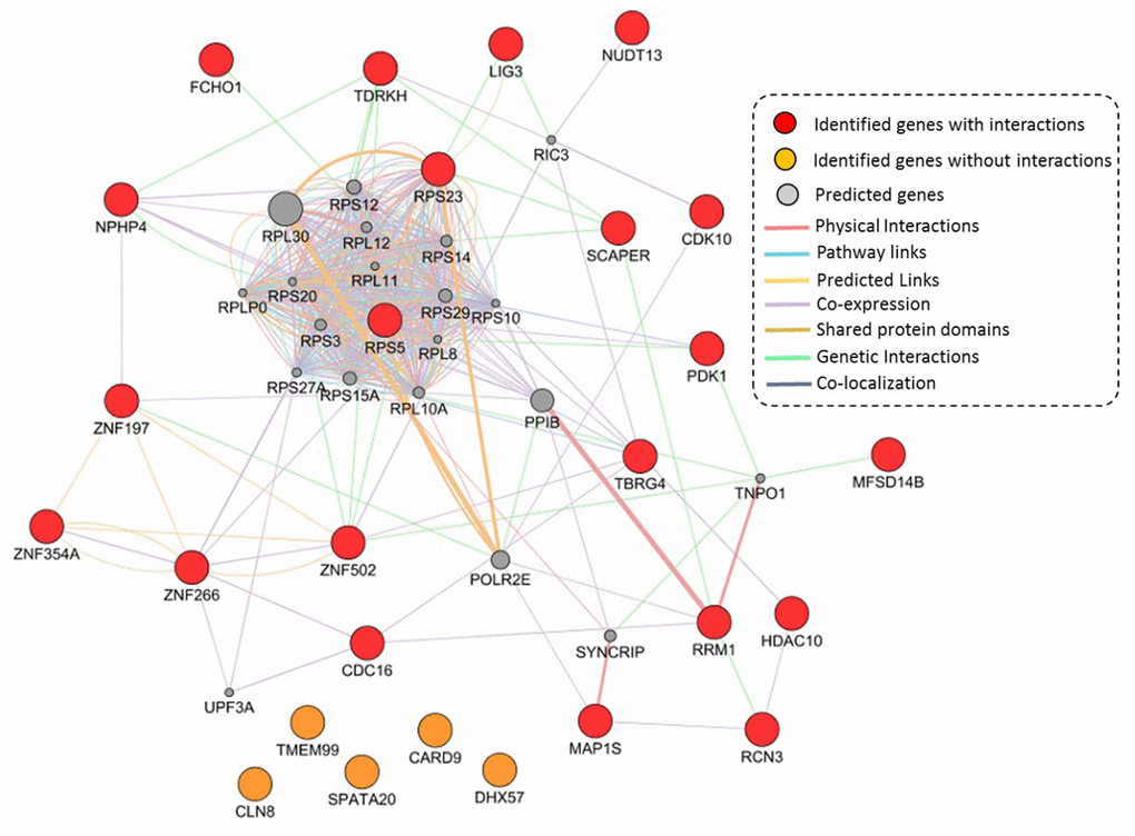 Based on independent biological and technical replications, we highlighted 26 genes as important candidates conferring susceptibility to TB. Based on these 26 genes, we performed a GGI network enrichment analysis. Figure 5 demonstrates that most of these highlighted genes were highly connected with each other. The majority of interactions in the constructed network were depended on co-expression, which accounted for 71.52% of interactions (Supplementary Table 16 and Supplementary Figure 17). For example, the hub gene of RPS5 had co-expression evidence with NPHP4 and PDK1. Furthermore, the hub gene of RPS23 showed a genetic interaction with SCAPER, as well as the SCAPER gene interacted with TDRKH based on evidence of genetic interactions. It should be noted that 5 TB-associated genes of CLN8, TMEM99, CARD9, SPATA20, and DHX57 had no interactions with other genes in this constructed network (Figure 5).