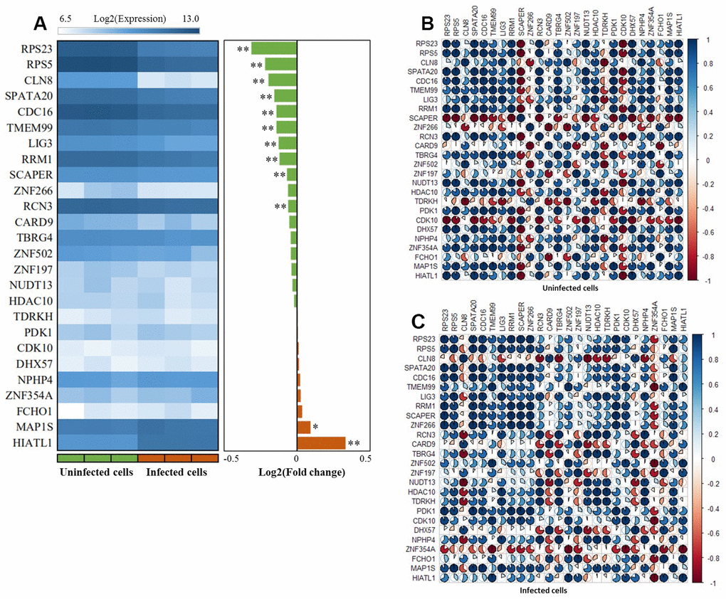 By utilizing the expression data of GSE133803, we performed a DGE analysis of these 26 highlighted genes and found 12 genes were significantly expressed between MTB-infected cells and controls (Figure 6A, Table 1, and Supplementary Table 17); for example, CDC16 (P = 5.63 × 10-4), RPS5 (P = 2.11 × 10-4), HIATL1 (P = 1.83 × 10-7), and RPS23 (P = 5.45 × 10-5). 2 genes of CARD9 (P = 0.055) and ZNF197 (P = 0.054) were identified to be suggestively significant (Supplementary Table 17). In light of most of interactions among genes were derived from co-expression (71.52%) in our GGI network analysis, we further conducted a Pearson correlation analysis to uncover whether the co-expression patterns of these highlighted genes altered or not between MTB-infected cells and uninfected cells. We detected that there was remarkable differences in co-expression patterns among 26 highlighted genes between MTB-infected cells and uninfected cells (Figure 6B, 6C and Supplementary Tables 18, 19). For example, the positive correlation coefficient of RPS23 with NUDT13 was decreased from 0.99 in uninfected cells to 0.34 in MTB-infected cells. Furthermore, the correlation coefficient between RCN3 and CLN8 was changed from 0.41 in uninfected cells to -0.92 in MTB-infected cells.
