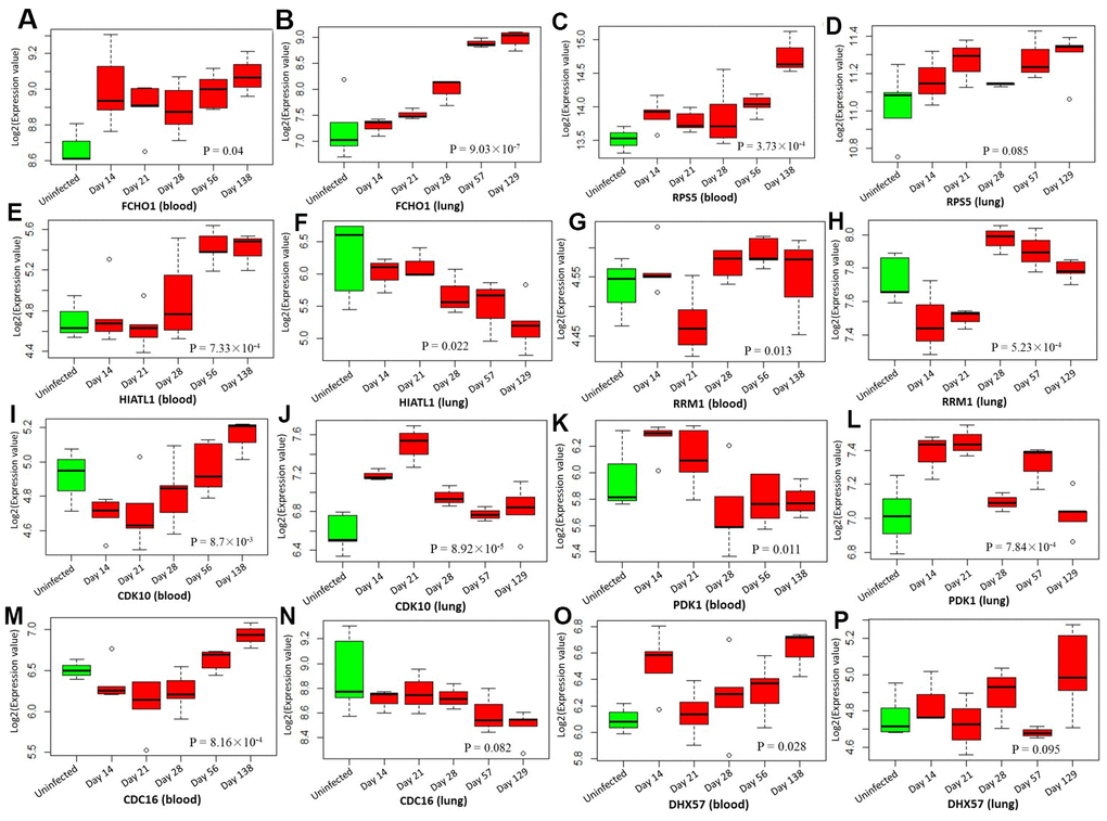 By analyzing the GSE1440943 dataset based on blood samples, 8 significant genes and 1 suggestive genes showed differential expressions between MTB-infected mice with 5 different time points and uninfected mice (Table 1, Figure 7 and Supplementary Figure 18). Furthermore, we analyzed the GSE1440944 dataset based on lung tissues and identified 11 significant genes and 3 suggestive genes have differential expressions between MTB-infected with 5 different time points and uninfected mice (Table 1, Figure 7 and Supplementary Figure 19). There existed a consistent finding of significant genes between both datasets (Table 1 and Figure 7). For example, 2 genes of FCHO1 and RPS5 showed significantly higher expression in MTB-infected mice at 5 time points than in uninfected mice in both blood (Figure 7A: Anova P = 0.04; and Figure 7C: Anova P = 3.73 × 10-4) and lung samples (Figure 7B: Anova P = 9.03 × 10-7 and Figure 7D: Anova P = 0.085). Consistently, by using the dataset of GSE139825 based on human alveolar macrophages, 7 significant genes (Anova P < 0.05; Supplementary Figure 20) and 4 suggestive genes (Anova P < 0.1; Supplementary Figure 21) showed differential expressions between TB group and control group. For example, RPS5 (Anova P = 2.74 × 10-4) and FCHO1 (Anova P = 7.12 × 10-3).