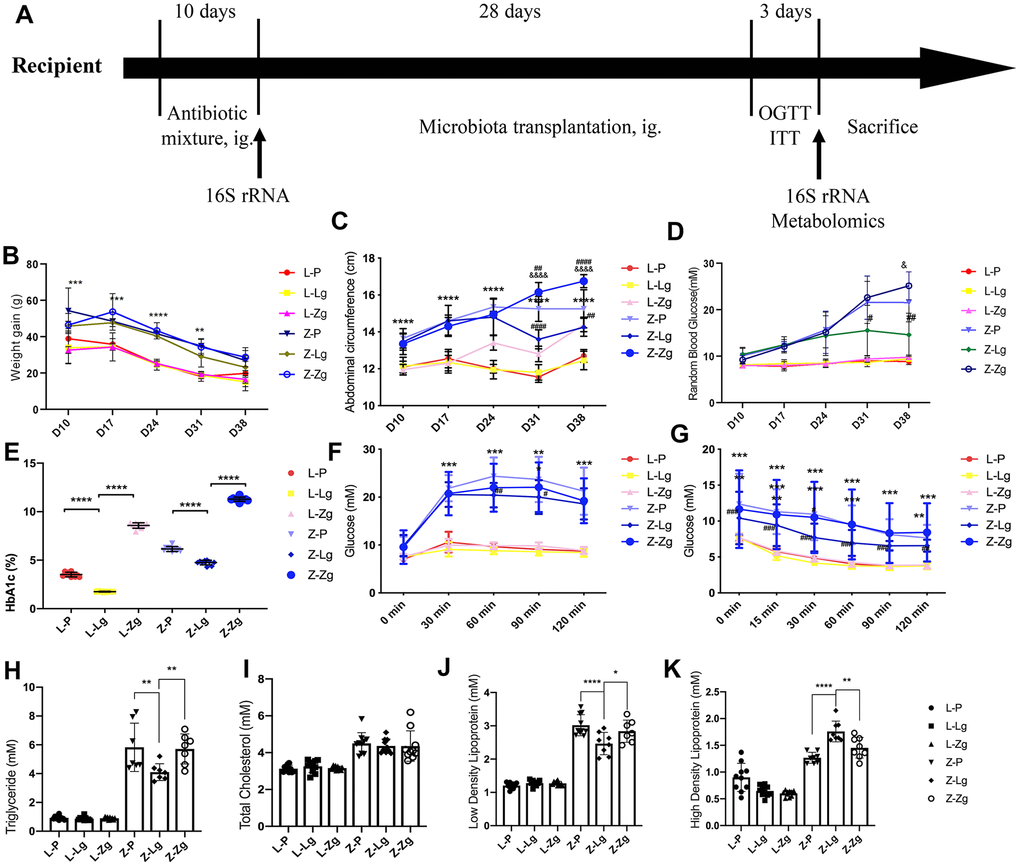 In the donor group, all metabolic evaluation indicators showed that the obese T2DM model was successfully induced in the ZDF group. These metabolic indicators were significantly different from the LZ group (Supplementary Figure 1A–1I). The experimental procedure was implemented as shown in Figure 1A. The group of LZ rats receiving LZ intestinal microorganisms was named L-Lg, receiving ZDF intestinal microorganisms was named L-Zg, and receiving PBS was named L-P. The ZDF recepient group was named the same way. Each transplantation group was given by gavage with a mixed antibiotic solution from D1-D10, and then transplanted the microbiota for 4 weeks. Record the corresponding data every week. From the third week of FMT, the metabolic characteristics of ZDF rats showed significant changes in response to transplantation. Figure 1B recorded the changes in the weight gain of the rats at different stages. The results showed that with the natural growth of the rats and the prolongation of the transplantation time, each group showed a slowing trend of the growth rate. For the LZ recipient rats, the weight gain had no changes in response to microbial transplantation, however, in ZDF recipient rats, the weight gains of rats transplanted with normal microbiota decreased significantly, while the weight gain of rats transplanted with obesity-T2DM microbiota had an increasing trend, and the abdominal circumference of the Z-Zg group increased significantly (P < 0.0001). The random blood glucose in the Z-P and Z-Zg groups was significantly higher than that in the Z-Lg group (P < 0.05), and the difference was more significant at 38 days (P < 0.001). Glycated hemoglobin was a good indicator of intra-group differences (Figure 1B–1E). These responses were not shown in LZ rats. The levels of glycated hemoglobin in the Z-P and Z-Lg groups showed a slightly lower trend than the L-Zg group, which seemed to be different from the level of random blood glucose. This may be due to the fact that random blood glucose responds to the immediate level of blood glucose and glycated hemoglobin reflects the average blood glucose level for a long time before the blood collection point, which is more stable and is not disturbed by the activities. The results of glycated hemoglobin levels in the L-Zg, Z-P and Z-Lg groups reflected that the blood glucose did not reach the state of hyperglycemia during 5-8 weeks of age, which was consistent with the natural growth of ZDF rats and the performance of random blood glucose. The higher level of glycated hemoglobin in L-Zg group could also reflect that although the short-term T2DM microbiota transplantation did not induce healthy LZ rats to form stable obesity and type 2 diabetes, but the rats also showed a corresponding trend. However, combined with body weight, OGTT, ITT and insulin-related levels, LZ rats still maintained a relatively stable health status. Changes in blood lipids indicated that Z-Lg group were superior to the Z-P group (Figure 1H–1K). OGTT and ITT showed that glucose tolerance and insulin tolerance were better in the Z-Lg group than in the Z-P and Z-Zg groups, suggesting that transplantation of the LZ intestinal microbiota improved the insulin resistance of ZDF rats (Figure 1F, 1G).
