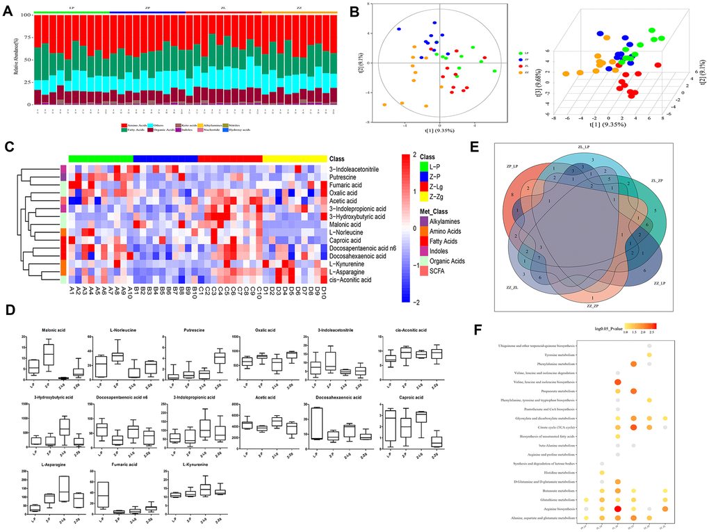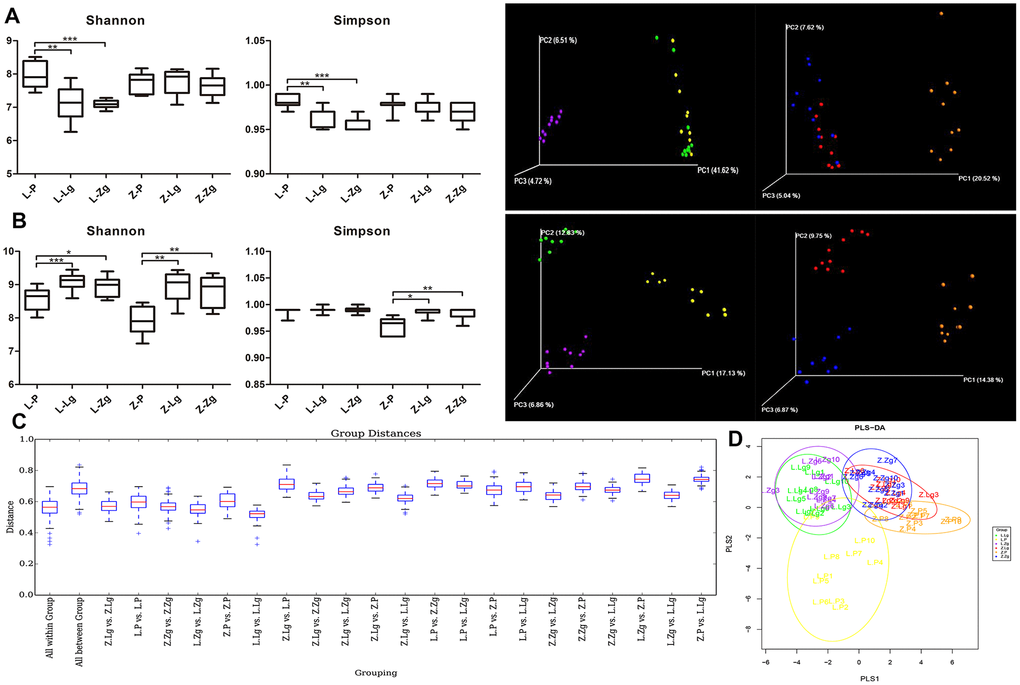 The intestinal community identification of donor rats showed that the α-diversity index and β-diversity index between the two groups were significantly different (Supplementary Figure 2A–2C). After FMT, Shannon index and Simpson index showed that Z-P was lower than Z-Lg and Z-Zg (P < 0.05) in the recipient group. Unweighted UniFrac PCoA analysis and UniFrac distance value difference box plots showed that there were significant differences between the groups, indicating that the intestinal microbial system has changed after FMT (Figure 2B, 2C). PLS-DA (Partial Least Squares Discriminant Analysis) showed that the L-Lg and L-Zg communities had a higher degree of aggregation, and the Z-Lg, Z-Zg, and Z-P groups had better separation (Figure 2D).