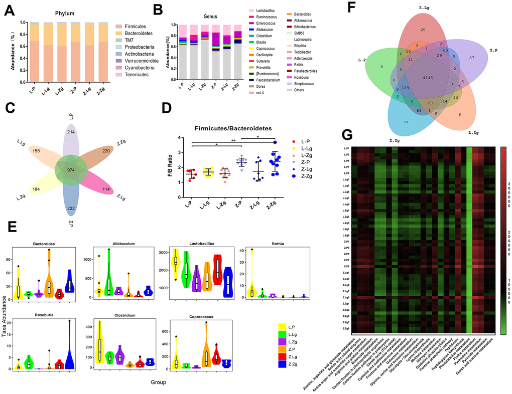 Different proportions of phyla were seen after FMT, of which more than 90% of the readings belonged to four phyla, Firmicutes, Bacteroidetes, TM7, and Proteobacteria. At the genus level, 26 categorical genera such as Lactobacillus, Ruminococcus, Enterococcus, and Allobaculum accounted for the major abundance (Figure 3A, 3B). In order to more clearly judge the diversity of microbiota composition between groups, we further used petal maps to show common and unique genera related to FMT. Different colors represented different modules. The petal map (node) in the center was shared by all groups, with a total of about 974 OTUs, which allowed us to see the different OTUs of each receptor group more clearly. The Z-P and Z-Zg groups showed more unique OTUs than that of LZ recepient rats, while LZ rats transplanted with ZDF microbiota showed a decrease in OTU, and ZDF rats transplanted with LZ microbiota showed an increase in OTU. This result further proved that the ZDF groups were more diverse than the LZ groups (Figure 3C). At the same time, Firmicutes / Bacteroides (F / B) ratio in the Z-Zg group increased significantly (Figure 3D). Consistent with the glycolipid metabolism phenotype, these changes did not respond to LZ recipient rats. The 16S rRNA gene sequence was conducted to determine identity. Metastats pairwise comparison test was performed according to the composition and sequence distribution of each sample at each taxonomic level, and the difference in sequence quantity between the samples (groups) of each taxon at the phylum and genera levels. Along with the invasion of the ZDF rats’ microbiota and the intensification of T2DM symptoms, Bacteroides showed high expression, while Lactobacillus, Roseburia, Coprococcus, Rothia, and Allobacum decreased, showing the opposite trend in the group of transplanted with LZ microbiota (Figure 3E). This was different from the differences identified in the donor group (Supplementary Figure 2A–2D and Supplementary Table 1). The microbes were interdependent and mutually antagonistic, maintaining the intestinal environment in a stable ecology and thus maintaining the health and stability of the body. However, the coordination mechanism between them is not completely understood. PICRUSt predicts the 16S rRNA gene sequence in the KEGG PATHWAY (http://www.genome.jp/kegg/pathway.html) database to obtain annotation information corresponding to each functional spectrum database for each sample. According to the abundance distribution of each functional group in each sample, R-software was used to calculate the number of common functional groups in each group, and the proportion of the functional groups shared and unique by each group was visually represented by a Venn diagram. The KEGG third-level pathway statistics showed that the microbiota results predicted that 25 pathways had significant changes, including nine in the carbohydrate pathway, seven in the amino acid metabolic pathway, five in the energy metabolism pathway, two in synthesis and metabolism, two in nucleotide metabolism and one in the enzyme family (Figure 3F, 3G).