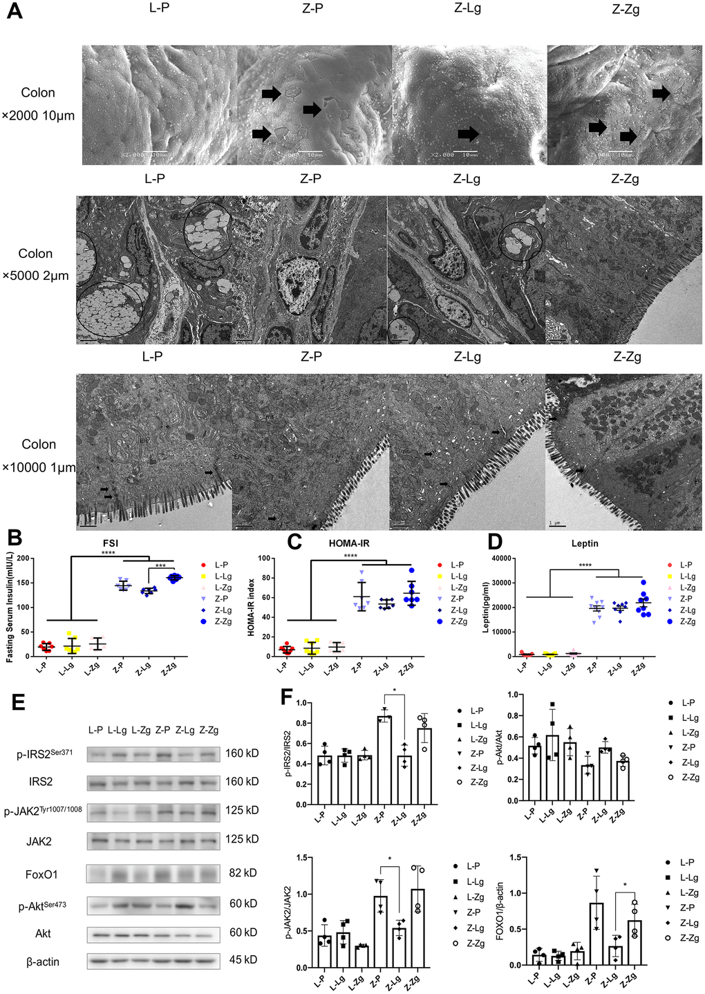 According to the experimental results of glycolipid metabolism phenotype and intestinal microbiota, when LZ rats were used as recipients, no matter whether the normal or T2DM microbiota was transplanted, the symptoms and microbial structure did not show significant changes compared with the control group. It could be speculated that healthy hosts were more powerful in regulating the balance in the body, even if their gut community composition were changed to a certain extent, they could still restore themselves and return to health. Therefore, when we delved into the directional role of microbial transplantation in disease progression, we chose the ZDF recipient group that was more significant in response to FMT. In order to investigate the relationship between the intestinal tissue structure and the changes in intestinal microbiota, we examined the colonic pathological characteristics of four groups of rats with scanning and transmission electron microscopy. In the L-P group, microvilli were orderly and undamaged, and the number of goblet cells was high, the tight junction between cells was complete and compact, and mitochondria were high in number, large in volume, and complete in structure. In the Z-P group, typical microvilli were damaged and shed, and the number of goblet cells was reduced, mitochondria were swollen and cristae were arranged disorderly. In the Z-Lg group, the damage was less, but still existed while the most serious mucosal damage was found in Z-Zg group (Figure 4A). At the same time, fasting serum insulin (FSI) level showed that Z-Lg was lower than Z-Zg (P < 0.001) (Figure 4B–4D). The integrity of intestinal barrier is very important to health [29, 30] and one of the characteristics of obesity and T2DM is the damage of intestinal structure and barrier function [31, 32]. With the age increasing, the random blood glucose of ZDF rats continued to increase, but FSI and leptin were also high, indicating the presence of IR and LR. The liver is the key gatekeeper for draining intestinal blood from the portal vein. Even in a healthy state, the liver is often challenged by metabolic stress from gut microbiota and their metabolites. A complete intestinal epithelial barrier protects the liver from enormous bacterial exposure [33]. After the intestinal barrier is damaged, bacterial translocation and endotoxins enter the portal vein system, causing immune damage and inflammation, damage to distal organs, and impairment of the function of the body in multiple ways. The liver is the main peripheral target tissue for leptin and insulin, which regulate glucose metabolism. Transplanting the microbiota of LZ rats decreased p-JAK2 in the liver, and the expression of FoxO1 was inhibited by IRS / Akt pathway, while transplanting the microbiota of ZDF rats showed the opposite (Figure 4E, 4F). In other words, transplanting the microbiota of thin control rats can reduce the glucose metabolism dysfunction due to gene defects by regulating insulin resistance and leptin resistance, while transplanting the microbiota of obese T2DM rats will aggravate IR and LR.