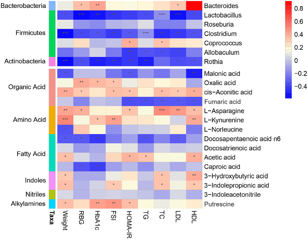 To comprehensively analyze the relationship among the host phenotype, the intestinal microbiota, and the intestinal microbial metabolites, a correlation matrix was generated by calculating the Spearman correlation coefficient (Figure 6). In the obesity-T2DM process, three genera, Lactobacillus, Clostridium, and Rothia, showed a negative correlation with all phenotypes and might be an effective intervention for delaying the progression. Lactobacillus can regulate the balance of serum lipids, glucose, etc. through bile acids, benzene derivatives, organic acids, and others to promote lipid absorption, maintain intestinal barrier function transport, and conduct endocrine function signals; Clostridium can affect intestinal permeability through bile acids, lipids, etc. and activate the intestinal-brain-hepatic nerve axis to regulate glucose balance; Rothia can provide energy to the colonic epithelium by producing SCFAs and participate in the progression of obesity, insulin interference, and T2DM. Allobaculum is more closely related to obesity indicators. We further demonstrated that 3-hydroxybutyric acid, docosahexaenoic acid, n6, 3-indolepropionic acid, acetic acid, docosahexaenoic acid, and hexanoic acid were significantly increased; these may be key metabolites that can delay the progression of obesity to T2DM. Fumaric acid was negatively correlated with HOMA-IR and other blood lipid indicators, and may be an effective substance for obesity control. Fatty acids such as docosapentaenoic acid N6 and caproic acid were negatively correlated with blood glucose and glycosylated hemoglobin, and may be closely related to a delay in progression to T2DM. The mechanisms of fatty acids [34–36] and amino acids [14, 37–39] and their derivatives [40–42] are being explored. The intestinal-insulin axis formed by the host and microbiota during symbiotic evolution regulates the insulin level [43], which confirmed that there is a close relationship between microorganism and host in the course of obesity-T2DM.