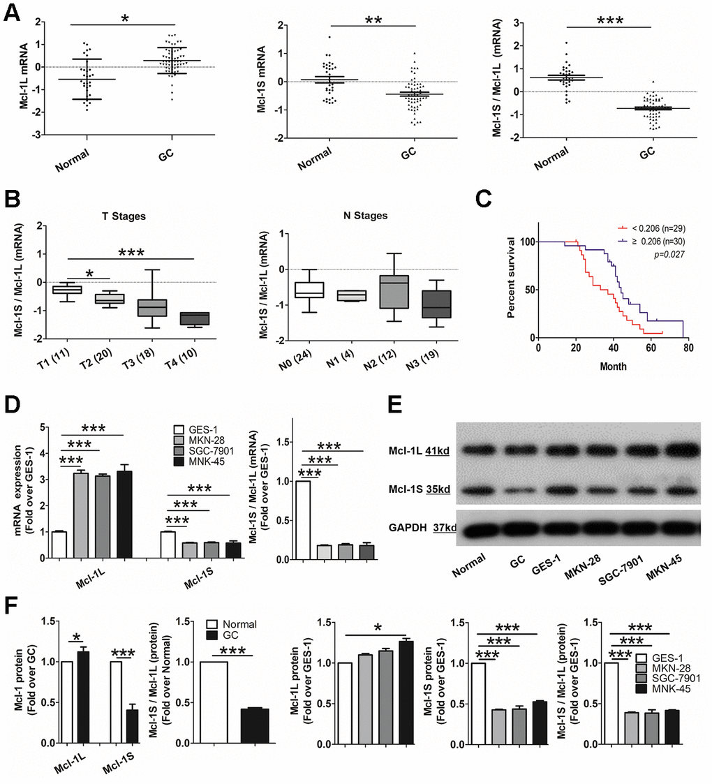 Next, to confirm the role of Mcl-1L and Mcl-1S in human GC, a series of histological and molecular analyses were performed. Quantitative reverse transcription-polymerase chain reaction (RT-qPCR) results showed that Mcl-1L mRNA expression was significantly higher (p <0.05) and Mcl-1S mRNA expression was lower (p <0.01) in tumor specimens than in normal gastric mucosal tissues. Consistent with this difference, the Mcl-1S/Mcl-1L mRNA ratio was significantly decreased (p <0.001) in GC (Figure 1A). Moreover, this decrease was accompanied with progression of T stages, instead of N stages (Figure 1B). This result indicated that Mcl-1L over-expression and/or Mcl-1S under-expression was closely related to tumor size increase but not to lymph node metastasis [31]. Only one patient in the M stage developed distant metastases and showed invalid statistics. Kaplan–Meier survival analysis showed that the overall survival of patients with lower Mcl-1S/Mcl-1L levels was decreased compared with that of patients with higher levels (Figure 1C). These results suggested that high Mcl-1L and low Mcl-1S expression levels in GC tissue were correlated with tumor proliferation and prognosis.