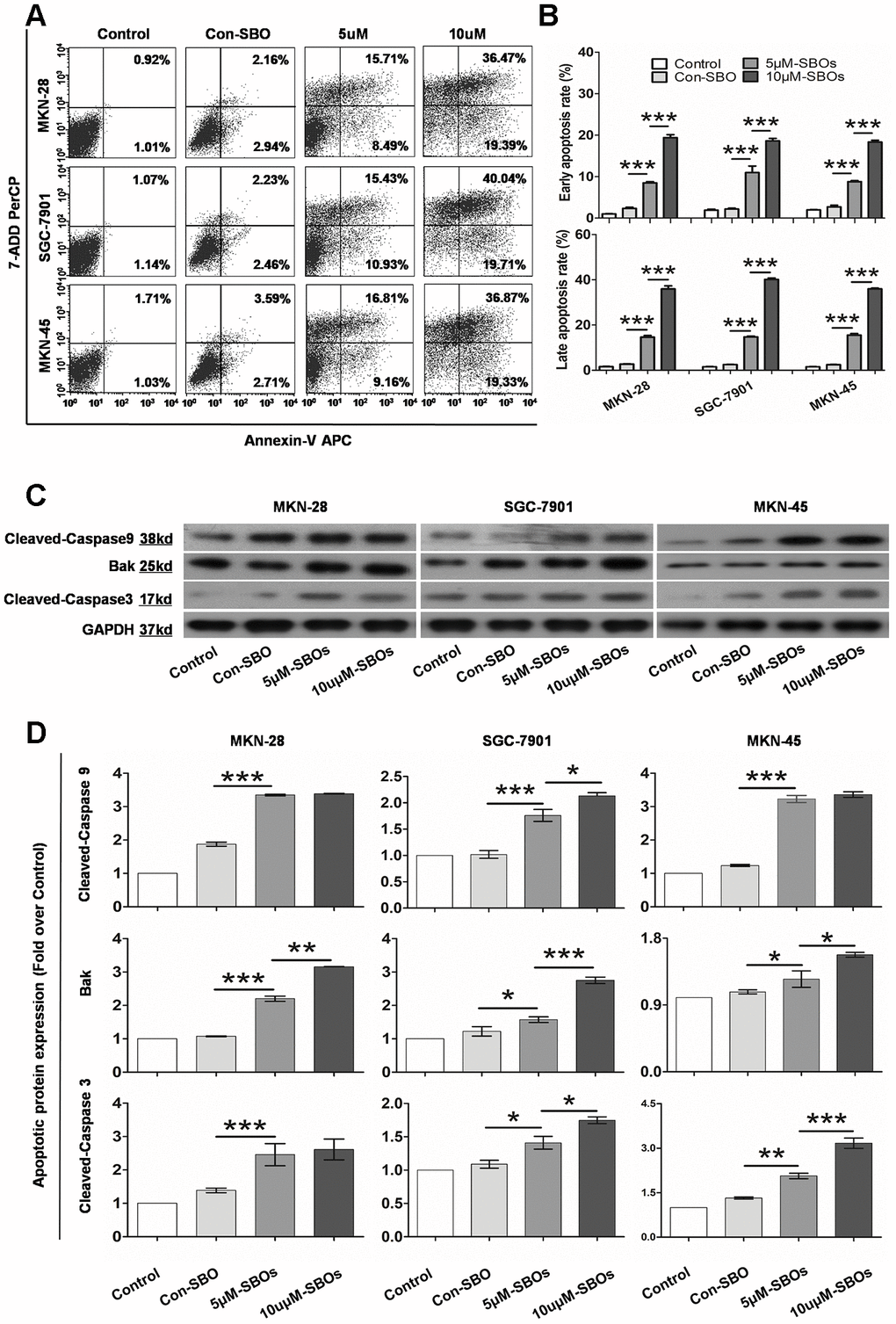 To validate whether the shift in the Mcl-1 splicing pattern from Mcl-1L to Mcl-1S enhanced GC cell apoptosis, the apoptotic cells were quantified by flow cytometry (FCM). Annexin V and 7-amino-actinomycin (7-AAD) were used to identify the early and late apoptotic cells, respectively. The results indicated that 48 h post-transfection of SBOs, the number of apoptotic cells increased in the three GC lines (Figure 3A). The apoptosis rates are summarized in Figure 3B, which shows that SBOs result in a significant dose-dependent increase in the number of both early and late apoptotic cells. Western blotting (WB) was performed to evaluate apoptosis by detecting the key markers of apoptosis (Bak, cleaved caspase 9, and cleaved caspase 3) (Figure 3C). The integrated density values indicated that the expression of apoptotic factors in SBO-treated GC cell lines showed statistically significant acceleration with a clear dose-response relationship (Figure 3D). Collectively, these data verified that modification of the Mcl-1 splicing pattern from Mcl-1L to Mcl-1S using SBOs strikingly stimulated GC cell apoptosis.