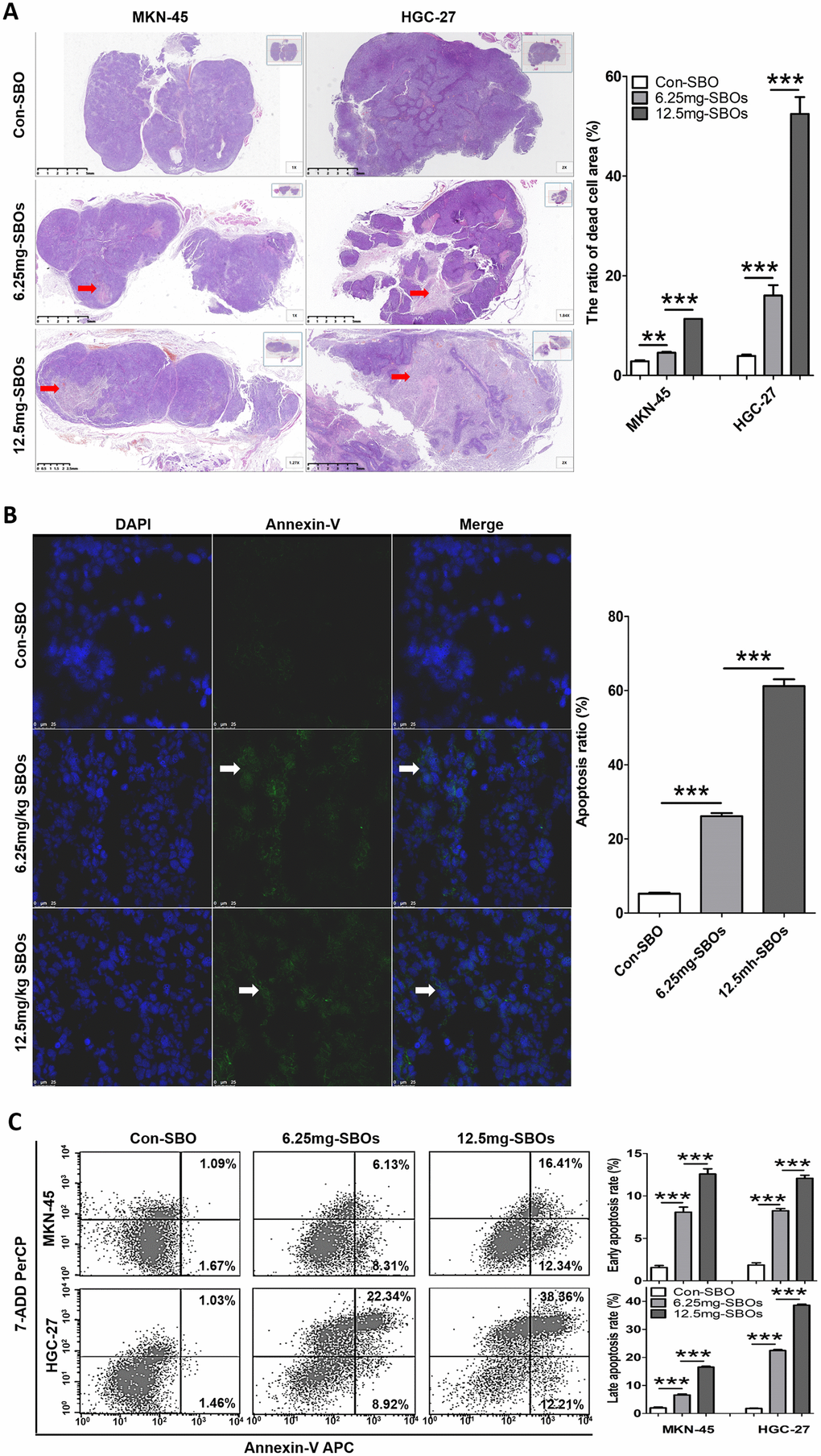 To validate whether Mcl-1 pre-mRNA alternative splicing using SBOs could induce tumor cell apoptosis in vivo, apoptotic cells were detected in the xenograft models. In the mouse xenograft models of both MKN-45 and HGC-27 cells, hematoxylin and eosin (HE) staining revealed a dose-dependent increase in the dead cell area of the SBO-treated tumor tissue, compared with that of the control (Figure 5A). Immunofluorescence assay of the HGC-27 xenograft tumors demonstrated that SBO treatment resulted in a dose-dependent increase in the number of apoptotic cells (annexin V-positive) (Figure 5B); identical results were observed in the MKN-45 xenograft models (not presented in current study). Correspondingly, quantitation by FCM showed that treatment with 0, 6.25, and 12.5 mg/kg SBOs led to apoptosis rates of 2.76, 14.44, and 28.75% in the MKN-45 xenograft models and 2.49, 31.26, and 50.57% in the HGC-27 xenograft models, respectively. The results showed that the early and late apoptosis rates increased in a statistically significant dose-dependent manner (Figure 5C). Additionally, after Mcl-1-specific SBO treatment for 3 d, Bak, activated caspase 9, and caspase 3 expression levels in the tumor tissues were markedly elevated in a dose-dependent manner (Supplementary Figure 3). These results indicated that the shift in Mcl-1 splicing from Mcl-1L to Mcl-1S induced significant cell apoptosis in gastric xenograft tumors.