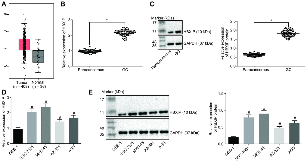 Firstly, the expression pattern of HBXIP was detected to be upregulated in GC samples by the Cancer Genome Atlas (TCGA) database (Figure 1A). This upregulation was further verified by means of reverse transcription quantitative polymerase chain reaction (RT-qPCR) and Western blot analysis, which demonstrated that the expression of HBXIP in GC tissues was significantly higher compared to that in paracancerous tissues (Figure 1B, 1C). Consistently, the findings revealed a higher expression of HBXIP in the GC cell lines compared to the human normal gastric epithelial cell line GES-1 (Figure 1D, 1E). The aforementioned results signified that HBXIP was highly expressed in both GC tissues and cells.