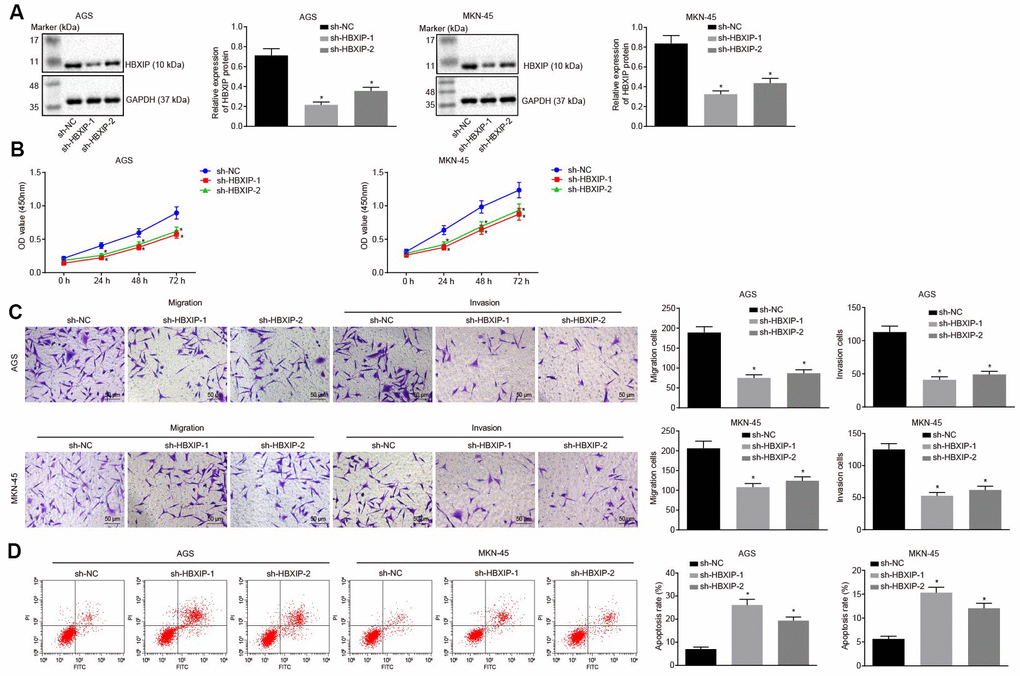 Silencing HBXIP inhibited GC cell viability, migration and invasion while inducing apoptosis