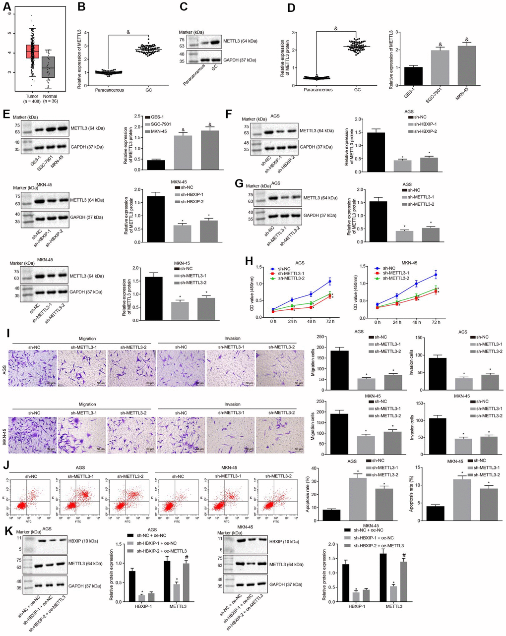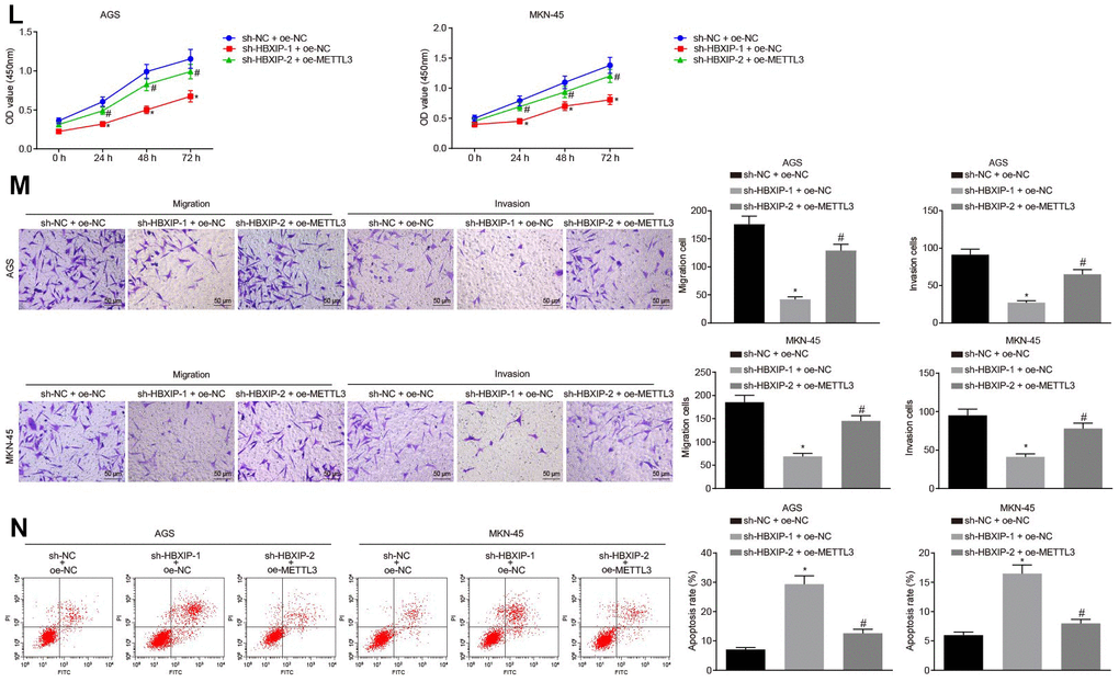 (L) Viability of AGS and MKN-45 cells examined by CCK-8 assay upon HBXIP silencing or combined with METTL3 overexpression. (M) Migration and invasion of AGS and MKN-45 cells were examined by Transwell assay upon HBXIP silencing or combined with METTL3 overexpression (× 200). (N) Apoptosis of AGS and MKN-45 cells examined by flow cytometry upon HBXIP silencing or combined with METTL3 overexpression. * p < 0.05 vs. the sh-NC or sh-NC and oe-NC group (AGS or MKN-45 cells treated with sh-NC or both sh-NC and oe-NC). # p < 0.05 vs. the sh-HBXIP and oe-NC group (AGS or MKN-45 cells treated with both sh-HBXIP and oe-NC). The above results were measurement data, and expressed as mean ± standard deviation. Data in panels B and C were compared by paired t test, in panels (D–G, I–K, M and N) were analyzed by one-way ANOVA with Tukey’s post hoc test, and in panels H and L by repeated measures ANOVA with Bonferroni post hoc test. The cell experiment was repeated 3 times independently.
