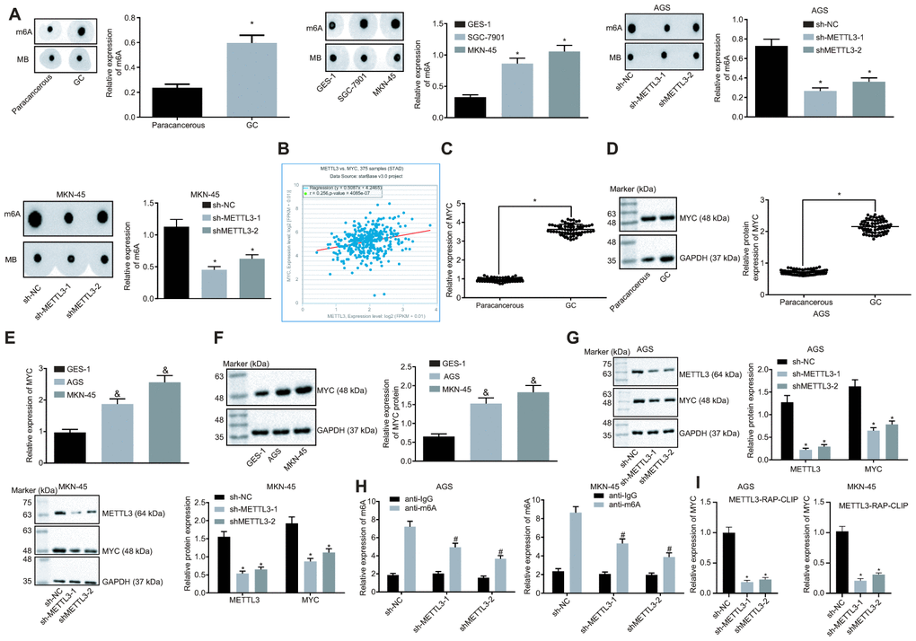 METTL3 a methylase catalyzes the methylation of m6A in mRNA [20]. The preceding findings demonstrated that METTL3 was highly expressed in GC tissues and cells. To ascertain whether METTL3 affected the m6A modification level of mRNA in GC cells, dot blot assays were performed and the results (Figure 4A) showed that mRNA m6A levels were significantly elevated in GC tissues compared to the paracancerous tissues. In contrast to the human normal gastric epithelial cell line GES-1, the m6A level in GC cells was higher. After silencing METTL3, the m6A level of intracellular mRNA was significantly reduced, suggesting that METTL3 stimulated m6A modification of mRNA in GC cells. In addition, an existing study indicated that the methylation enzyme METTL3 could increase the MYC expression by performing m6A modification of the MYC mRNA in bladder cancer [16]. The co-expression analysis of METTL3 and MYC in GC in the TCGA database (Figure 4B) revealed a positive co-expression relationship between METTL3 and MYC. The findings of Western blot analysis revealed a notably increased expression pattern of MYC in GC tissues and cells (Figure 4C–4F). After silencing METTL3, the MYC expression was significantly reduced in GC cells (Figure 4G), thereby suggesting that METTL3 silencing decreased the expression of MYC in GC cells. The m6A level of MYC mRNA was examined by means of Me-RIP assay, the results of which showed that m6A level of MYC mRNA decreased after silencing METTL3 in GC cells (Figure 4H). Additionally, photo-activatable ribonucleoside-enhanced crosslinking and immunoprecipitation (PAR-CLIP) was performed to identify their relationship, the results of which showed a reduction in the expression of MYC mRNA in the immune complexes upon silencing METTL3 in GC cells (Figure 4I), indicating that the binding of METTL3 to MYC mRNA was weakened following METTL3 silencing. The aforementioned results indicated that the reduction of METTL3 led to decreased MYC expression by attenuating the m6A modification of MYC mRNA in GC cells.