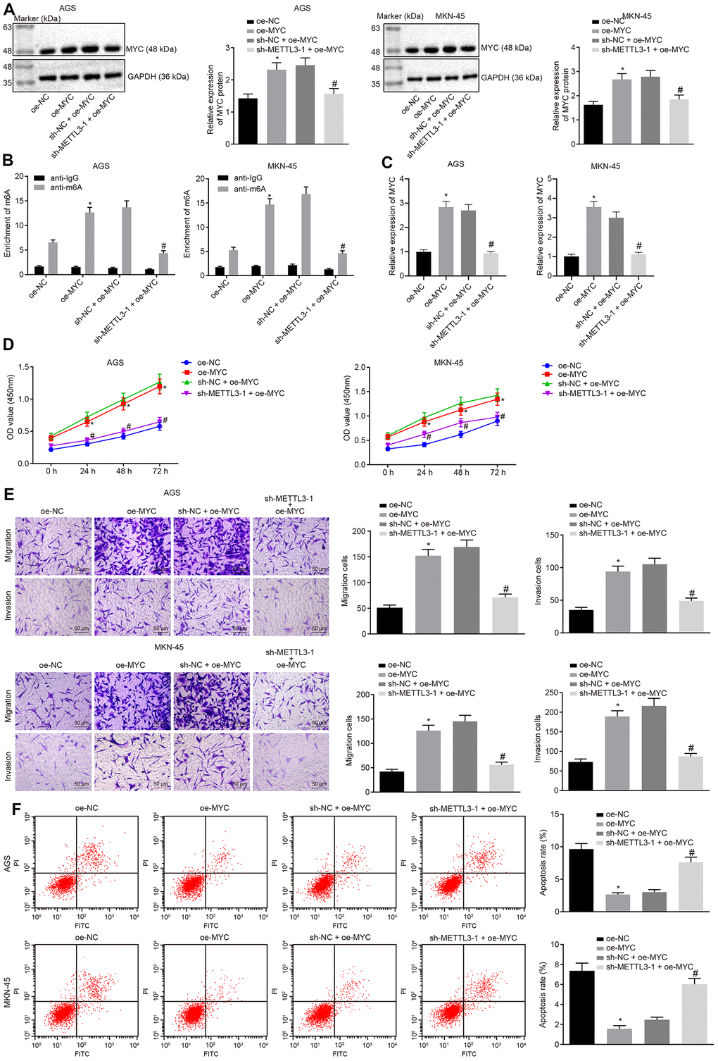 Next, we investigated the effects of METTL3 on GC through MYC. The cells were infected with the lentivirus expressing oe-MYC or in combination with lentivirus expressing sh-METTL3-1. Data of Western blot analysis (Figure 5A) showed that the MYC expression was increased in cells infected with the lentivirus expressing oe-MYC relative to the cells infected with lentivirus expressing oe-NC. In comparison to the cells infected with the lentivirus expressing both sh-NC and oe-MYC, the MYC expression was markedly reduced in cells infected with lentivirus expressing both sh-METTL3-1 and oe-MYC. Me-RIP assay was adopted to examine the m6A modification level of MYC mRNA in GC cells, the results (Figure 5B) of which showed that the m6A level of MYC mRNA was significantly increased in cells infected with lentivirus expressing oe-MYC compared to the cells infected with lentivirus expressing oe-NC. METTL3 silencing considerably diminished the m6A level of MYC mRNA in the presence of MYC. Besides, the results of PAR-CLIP assay revealed an enhanced binding of METTL3 to MYC mRNA when MYC was overexpressed, which could be reversed by METTL3-1 silencing (Figure 5C). Furthermore, as shown in Figure 5D–5F, compared to the cells infected with lentivirus expressing oe-NC, the proliferation, migration and invasive abilities of GC cells were potentiated in cells infected with the lentivirus expressing oe-MYC, while their apoptosis was decreased. However, METTL3 silencing reversed the simulative effects of MYC overexpression on the proliferation, migration and invasive potentials of GC cells along with the inhibitory effect on the apoptosis ability. The aforementioned results indicated that METTL3 silencing restrained the development of GC by inhibiting m6A modification of MYC mRNA in vitro.