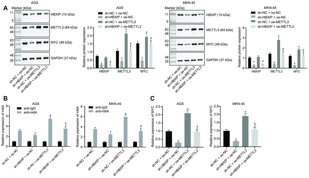 Among the biomarkers, MYC fundamentally functions as an oncogene that induces tumor cell growth and inhibits cellular apoptosis in various cancers [9]. For example, MYC modulates numerous microRNAs (miRNAs or miRs) including the oncogenic and antigenic ones essential in modulating liver cancer progression [10]. In the event of GC, MYC upregulates long non-coding RNA (lncRNA) H19 expression to proliferate GC cells and MYC expression represents a prognostic factor in GC patients [11]. METTL3 gene encodes N6-adenosine-methyltransferase that initiates the post-transcriptional methylation of the internal adenosine residues at its N6 site in eukaryotic mRNAs [12]. Research has regarded METTL3 to function as an oncogene that promotes the growth of cancer cells in various cancers such as GC and ovarian carcinoma [13, 14]. More importantly, METTL3 by stimulating the translation process of oncogenes functions as a N6-methyladenosine (m6A) methyltransferase in tumor cells [15]. Additionally, METTL3 can manipulate the methylation of MYC mRNA to facilitate the translation of the MYC protein. In bladder cancer, METTL3 regulates methylation of MYC as well as two specific factors in the nuclear factor-kappaB (NF-κB) pathway to stimulate the overall tumorigenesis [16]. Similarly, METTL3 can increase MYC mRNA level by m6A methylation and stimulate the proliferation of acute myeloid leukemia cells [17]. Hepatitis B X-interacting protein (HBXIP) is a HBV X-interacting protein located in the lysozyme, which is elicited as a contributor to the poor prognosis of GC patients [18]. HBXIP can extensively elevate the expression of METTL3 and concurrently inhibit let-7g so as to promote breast cancer progression [19]. However, the potential involvement of HBXIP in the development of GC is undetermined. Therefore, the current report elucidated the regulation of HBXIP on MYC by employing METTL3, which revealed that methylation of MYC mRNA, increased its stability and subsequently promoted the GC progression.