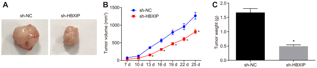 Finally, to investigate the impact of HBXIP on the growth of GC xenografts in vivo, a tumor xenograft model was established in nude mice. The experimental results (Figure 7A–7C) showed that the tumor volume and weight of mice bearing cells treated with sh-HBXIP decreased significantly, thereby indicating that silencing HBXIP restrained the gastric tumorigenesis.