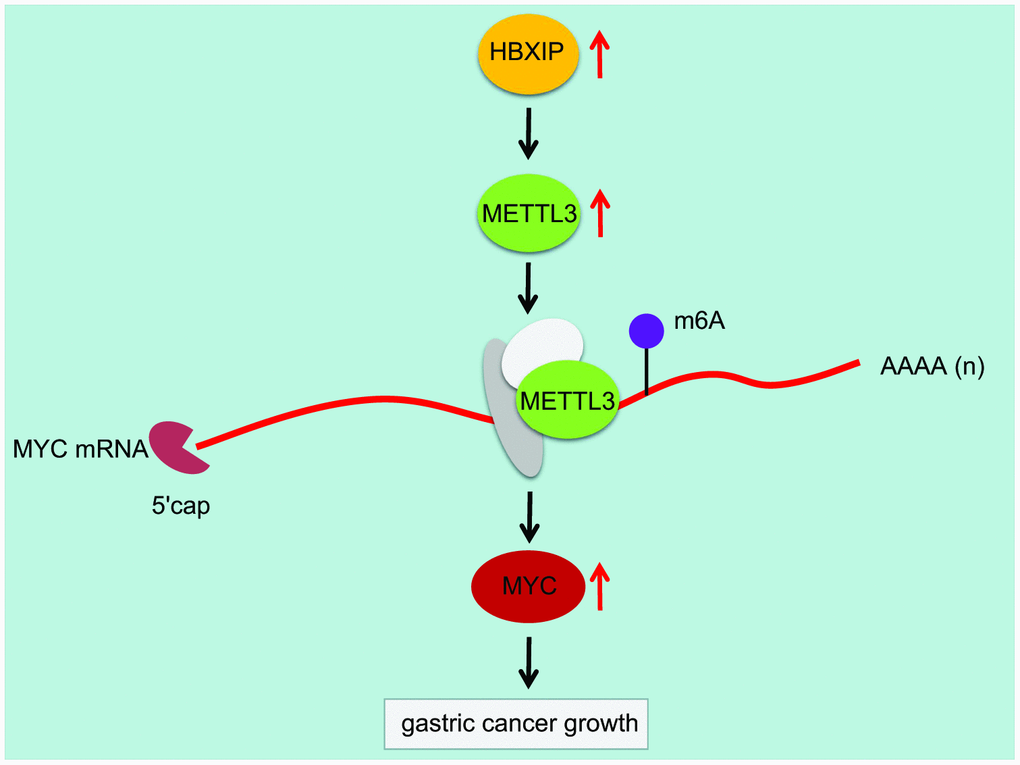 Overall, we initially observed that the regulatory axis of HBXIP/METTL3/MYC was involved in GC progression (Figure 8). HBXIP could upregulate the expression of METTL3, which successively elevated the m6A modulation of MYC mRNA. Inhibition of HBXIP could reduce the m6A level of MYC mRNA by impairing METTL3-mediated m6A modulation of MYC mRNA, whereby finally hindering the progression of GC in mice. Our findings concluded the functionality of m6A modulation in diverse cancers, which emphasize on the critical function of RNA modulation post-transcriptionally. Even though the role of the HBXIP/METTL3/MYC axis on GC was uncovered by this study, the downstream signaling pathway that regulates the apoptosis of GC cells should be investigated further.
