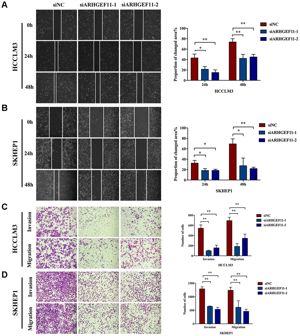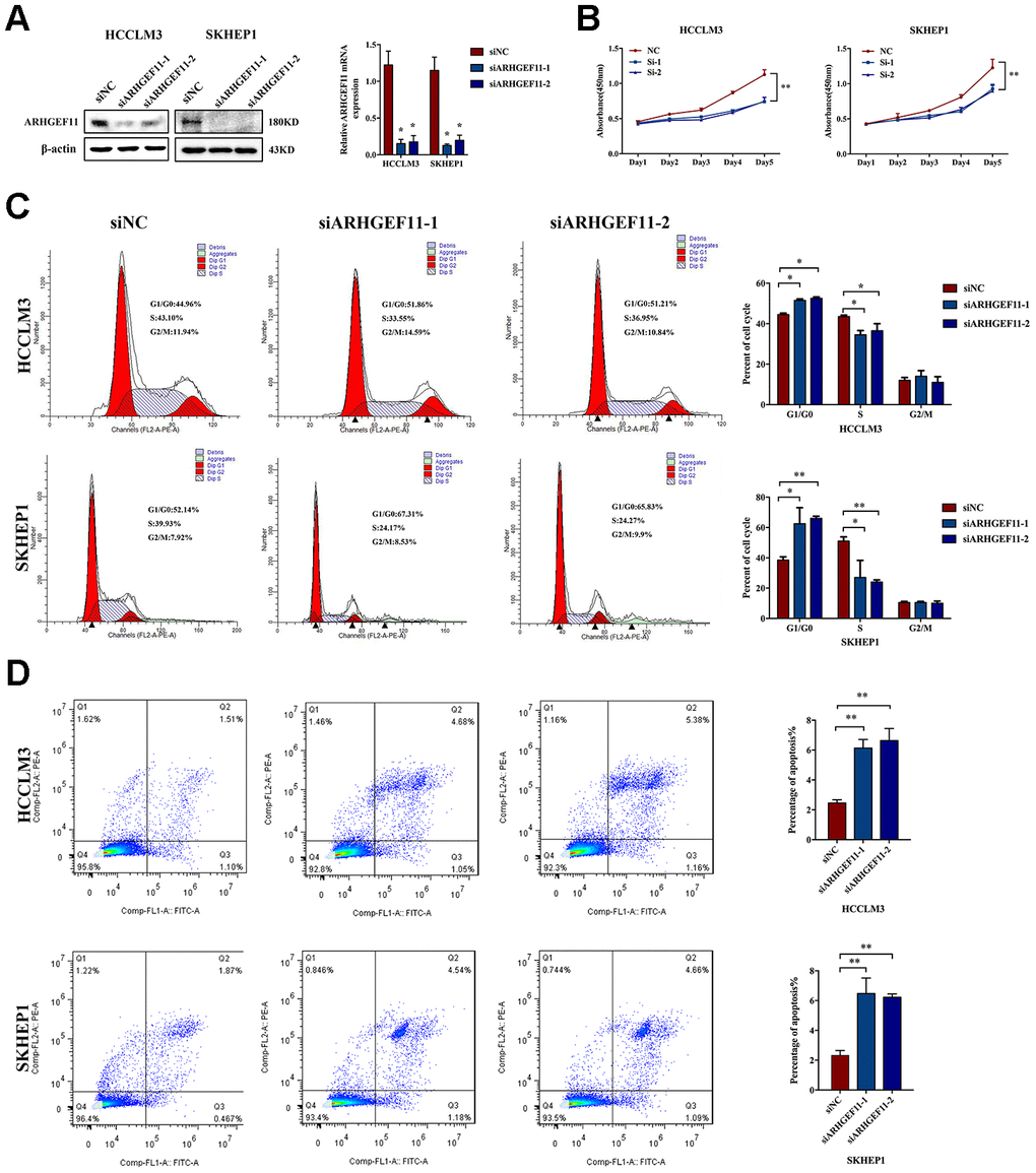 To understand the functions of ARHGEF11 upregulation in HCC progression, we silenced ARHGEF11 expression with two siRNAs (siARHGEF11-1 and siARHGEF11-2) in two highly metastatic hepatoma cell lines: HCCLM3 and SKHEP1. Successful siRNA-mediated knockdown of ARHGEF11 in both cell lines was confirmed via western blot and qRT-PCR analysis (Figure 2A). ARHGEF11 downregulation significantly inhibited the cell viability of hepatoma cells as detected by CCK-8 assay (Figure 2B). To further explore the ARHGEF11 roles in proliferation of hepatoma cells, we detected the cell cycle after knocking down ARHGEF11. Increased G0/G1 phase and decreased S phase proportions were observed in ARHGEF11-silenced hepatoma cells (Figure 2C). In addition, downregulation of ARHGEF11 induced apoptosis (Figure 2D). Moreover, it was shown that downregulation of ARHGEF11 significantly weakened the motilities of hepatoma cells (Figure 3A–3D). While, knockdown of ARHGEF11 had no impact on the cell viability and apoptosis of the non-neoplastic cell line L0-2, indicating the nonlethal character of ARHGEF11 (Supplementary Figure 1A and 1B). Collectively, these results demonstrated that ARHGEF11 functions as an oncogenic driver in cell growth and metastasis of HCC.