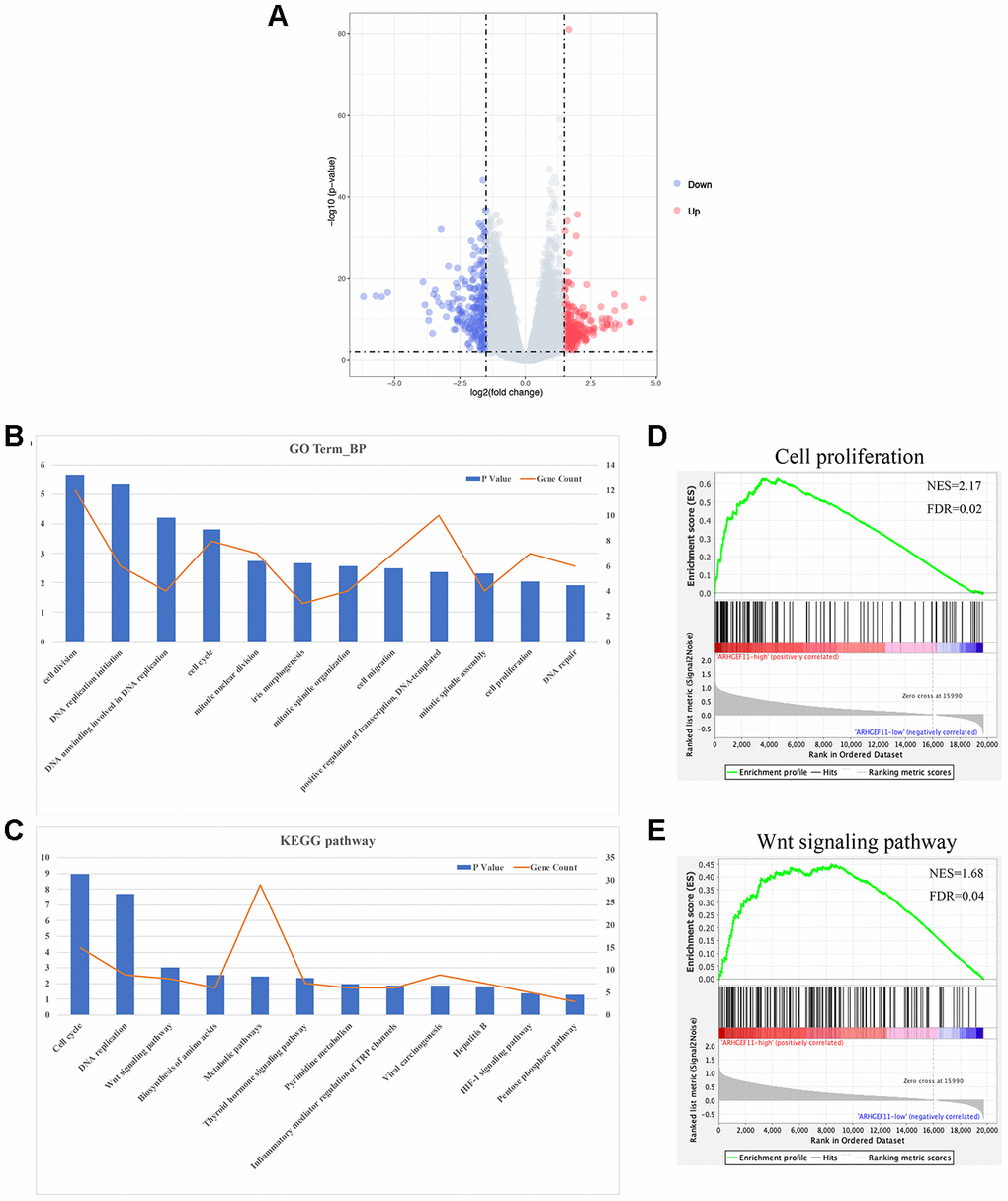 To explore the molecular mechanisms of ARHGEF11-mediated HCC progression, we performed a bioinformatic analysis to profile the differentially expressed genes (DEGs) between ARHGEF11-high expression and ARHGEF11-low expression groups based on the RNAseq data from TCGA. A total of 458 DEGs were identified (|logFC|≥1.5, P<0.01), including 230 up-regulated genes and 228 down-regulated genes in ARHGEF11-high group compared to ARHGEF11-low group (Figure 4A). The GO and KEGG analysis showed that high expression of ARHGEF11 was related to cell proliferation, cell cycle, cell migration and Wnt signaling pathway (Figure 4B and 4C). Moreover, GSEA analysis revealed that high ARHGEF11 expression was associated with the functional gene sets of cell proliferation and Wnt signaling pathway (Figure 4D and 4E). Given the fact that Wnt/β-catenin signaling pathway was closely related to both cell proliferation and cell migration processes [9, 15], these results implied that ARHGEF11 might regulate HCC cell proliferation and cell migration via Wnt/β-catenin signaling pathway.