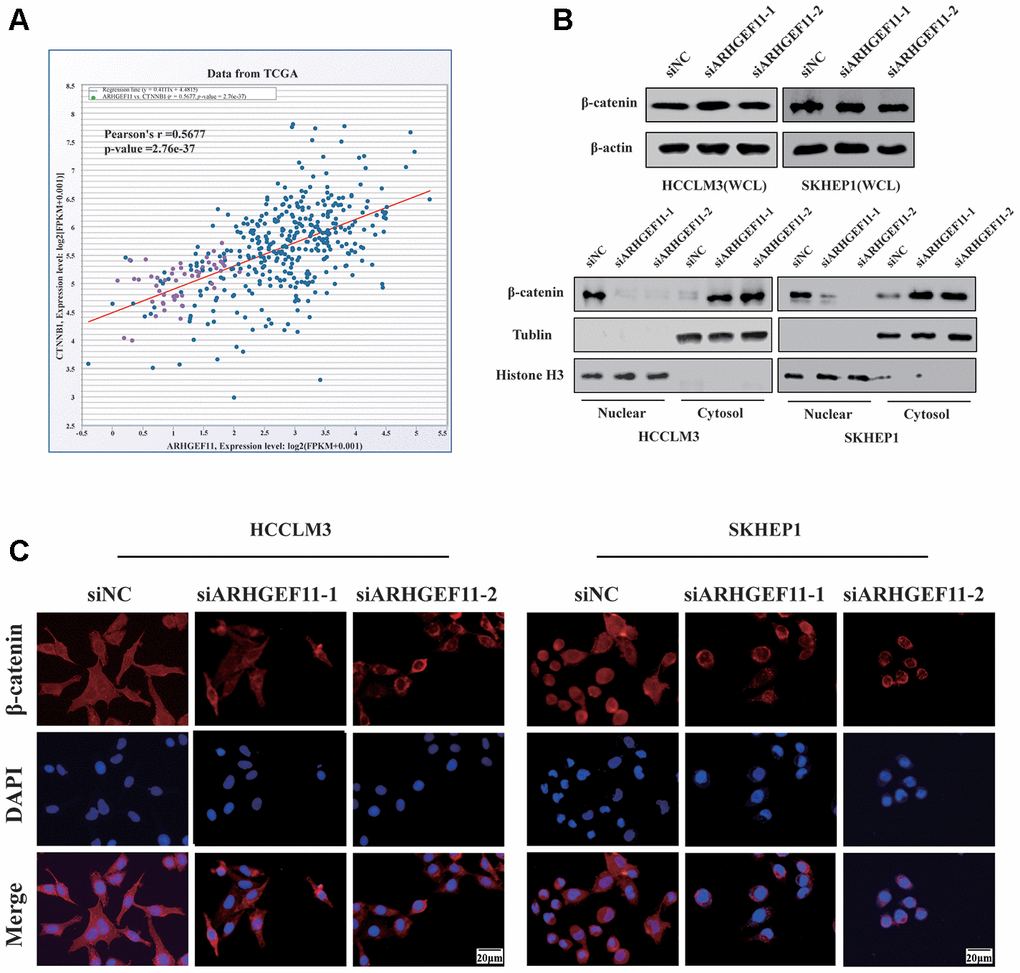 To verify whether ARHGEF11 could regulate Wnt/β-catenin signaling pathway, we first tested the correlation between the mRNA expression levels of ARHGEF11 and β-catenin in TCGA dataset. The results showed a positive correlation between ARHGEF11 and β-catenin expression (Figure 5A). Next, we examined the protein expression levels of β-catenin after deleting ARHGEF11. As shown in Figure 5B, although the total β-catenin expression remained unchanged, we found that knockdown of ARHGEF11 induced an increase of cytolytic β-catenin levels and a decrease of nuclear β-catenin levels (Figure 5B). Additionally, immunofluorescence assay was performed to further explore the sub-cellular localization of β-catenin. Similarly, it was shown that β-catenin primarily accumulated in the cell nuclear of ARHGEF11-siNC cells, however, downregulation of ARHGEF11 significantly attenuated nuclear translocation of β-catenin, most of which were detained in the cytoplasm (Figure 5C). These results suggested that ARHGEF11 could activate β-catenin pathway through inducing nuclear translocation of β-catenin.