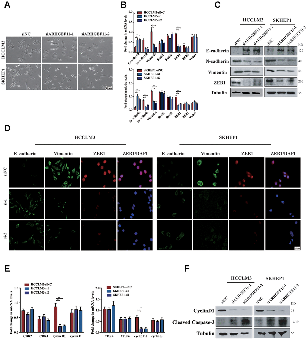 Activation of β-catenin has been shown to induce cell migration via ZEB1 (an important transcription factor during EMT)-mediated EMT process [16]. We further investigated whether ARHGEF11-induced β-catenin nuclear translocation could stimulate EMT process through upregulation of ZEB1. Silencing ARHGEF11 of the hepatoma cells induced an epithelial phenotype (Figure 6A). The mRNA levels of E-cadherin, N-cadherin, Vimentin and a panel of EMT inducer were determined by qRT-PCR (Figure 6B). Knockdown of ARHGEF11 in HCCLM3 and SKHEP1 cell lines caused a decrease of ZEB1 and an increase of E-cadherin, an epithelial cell marker that was negatively regulated by ZEB1 [17]. Consistently, N-cadherin and Vimentin, two mesenchymal cell makers, were upregulated by downregulation of ARHGEF11 (Figure 6B). However, ARHGEF11 had no impact on the other EMT inducers. These results were also verified by western blot and immunofluorescence analysis. ARHGEF11-silenced hepatoma cells displayed a clear increase in E-cadherin and a decrease in Vimentin as well as ZEB1 compared with the control group (Figure 6C and 6D).