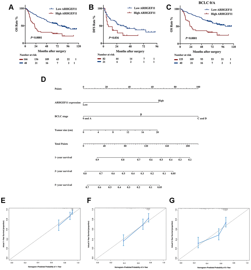 To reveal the clinical significance of ARHGEF11 overexpression, we divided a total of 214 HCC patients from West China Hospital dataset into ARHGEF11-high (n=166) and ARHGEF11-low (n=48) expression subgroups, according to the best cut-off point of ARHGEF11 expression analyzed by X-tile software. The clinicopathologic analysis indicated that higher ARHGEF11 expression was positively associated with advanced BCLC classification (Table 1). Kaplan-Meier analysis demonstrated that patients with higher ARHGEF11 levels had poorer OS and DFS outcomes (Figure 7A and 7B). In addition, patients with BCLC 0/A stage, an early stage of BCLC-staging classification, also displayed similar results (Figure 7C). Furthermore, univariate and multivariate analysis identified high ARHGEF11 expression, together with larger tumor size and advanced BCLC stage, as three independent risk factors for OS (Table 2). These independent risk factors were used to construct an OS risk estimation nomogram (Figure 7D). The discrimination performance for prognosis of HCC was internally validated through bootstrap method. This nomogram model displayed good accuracy in estimating overall survival rate, with a C-index of 0.70 (95% CI, 0.65 to 0.74). Furthermore, calibration curve demonstrated great accordance to predict 1-year and 3-year survival rate, while poor agreement on estimating 5-year survival rate (Figure 7E–7G). Taken together, these results indicated that ARHGEF11 could be used as a prognostic biomarker for HCC patients.