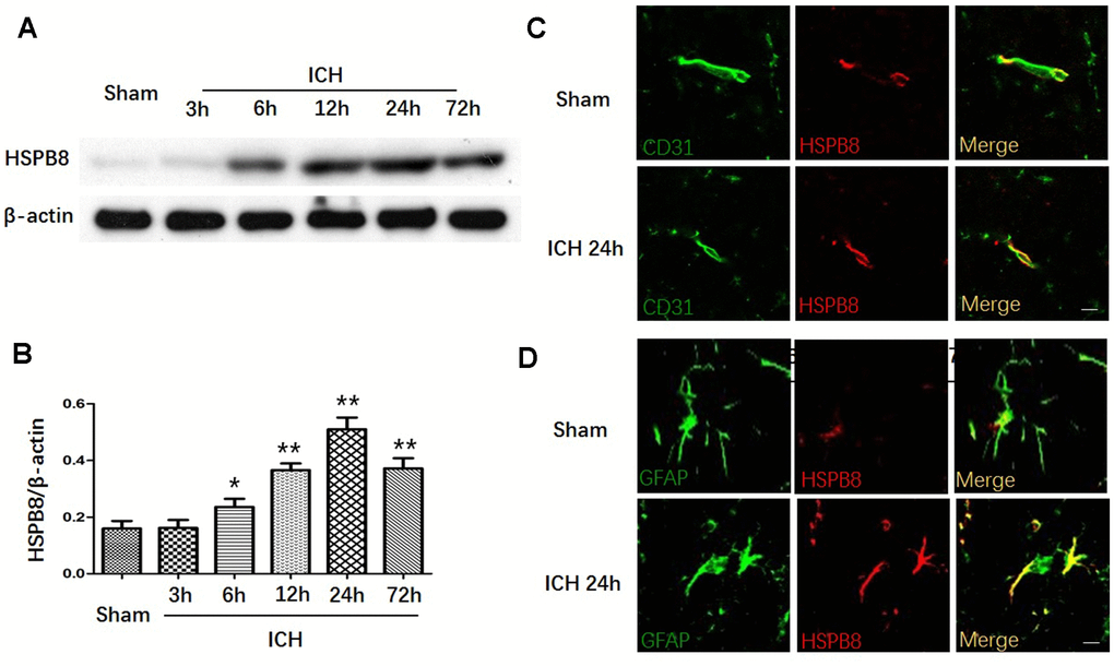 The aim of the first experiment was to examine the time course and spatial expression in perihematomal area after ICH. In our study, HSPB8 expression was significantly upregulated and peaked at 24h after ICH. Double immunofluorescence staining revealed that HSPB8 immunoreactivity was found sparsely in peri-hematoma GFAP-positive astrocytes and CD31-positive endothelial cells. ICH significantly increased expression of HSPB8 in these BBB elements. HSPB8 co-localized with endothelial cells and astrocytes and was upregulated after ICH, indicating that HSPB8 may play a significant role in regulating BBB permeability after ICH.