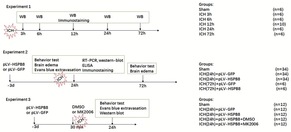 The study was divided into three parts as sketched in Figure 10. In experiment 1, 36 rats were randomly divided into six groups (n=6 for each group): sham, 3h, 6h, 12h, 24h and 72h after ICH, for western blot. 8 additional rats in the sham and 24 h groups(n=4) were used for double immunofluorescence staining of HSPB8 combined with specific markers for astrocytes, and microvessels.