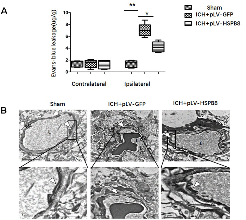 BBB functionality at 24h following ICH was evaluated by Evans Blue (EB) extravasation. As shown in Figure 4A, ICH caused a significant increased dye extravasation in ipsilateral hemisphere compared with the sham group. HSPB8 overexpression markedly attenuated the EB leakage compared with ICH+ pLV-GFP group (p < 0.05). We observed the ultrastructure of BBB in the perihematomal brain tissues by TEM. In normal condition, basal laminas were found to be continuous and integrate; the endothelial tight junctions (TJs) appeared as electron-dense linear structures. At 24h after ICH, the TJs of endothelial cells were seriously collapsed, which appeared as reduced electron density and endothelium detachment. HSPB8 overexpression notably reversed these damages (Figure 4B).