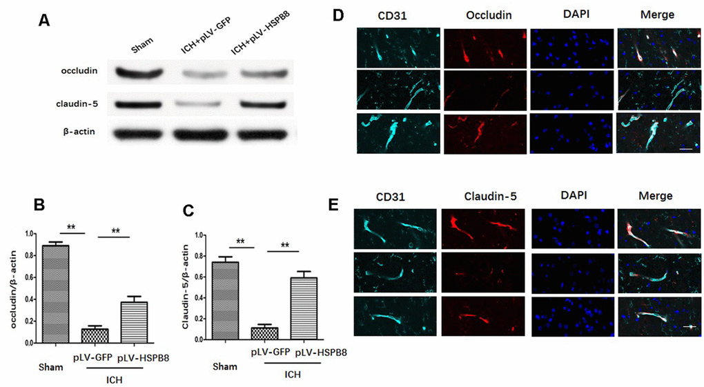 In experiment 2, 114 rats randomly divided into five groups: 1) sham (n = 34), 2) ICH (24h) + pLV-GFP (n = 34), 3) ICH(24h) + pLV-HSPB8(n = 34), 4) ICH (72h) + pLV-GFP (n = 6), 5) ICH(72h) + pLV-HSPB8(n = 6). pLV-GFP or pLV-HSPB8 was administered intracerebroventricularly 72h before ICH. Neurobehavior and brain edema (n=6), Evans-blue leakage (n = 8), enzyme-linked immunosorbent assay (ELISA) (n = 5), western-blot(n = 5), real-time reverse transcription-polymerase chain reaction (RT-PCR) (n = 5) and immunofluorescence staining of MPO, claudin-5 and occludin (n = 5) were applied to explore the role of HSPB8 in ICH