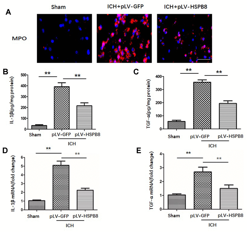 BBB compromise has been regarded as a key event in ICH-induced SBI through an orchestrated series of events to facilitate passage of the leukocyte into brain tissue, which subsequently exacerbates neuroinflammatory response [17]. Those inflammatory processes determine the severity and prognosis of ICH. Therefore, we then examined the effect of HSPB8 overexpression on the leukocyte infiltration at 24h after ICH. As depicted in Figure 6A, immunofluorescence staining of 24h after ICH revealed that significant presence of MPO+ neutrophils in the perihematomal tissue, which markedly attenuated by HSPB8 overexpression. To evaluate the neuroinflammatory response, pro-inflammatory cytokines, including tumor necrosis factor-α (TNF-α) and interleukin-1β (IL-1β), in perihematomal tissue were quantified by ELISA. As indicated in Figure 6B, 6C, HSPB8 suppressed ICH-induced proinflammatory cytokines secretion. Consistently, relative mRNA transcript levels of inflammatory cytokines in perihematomal regions increased markedly 24h after ICH, compared with sham group. HSPB8 overexpression attenuated the elevated mRNA level of TNF-α and IL-1β after ICH (Figure 6D, 6E). These results indicated that HSPB8 suppressed the inflammatory responses following ICH.