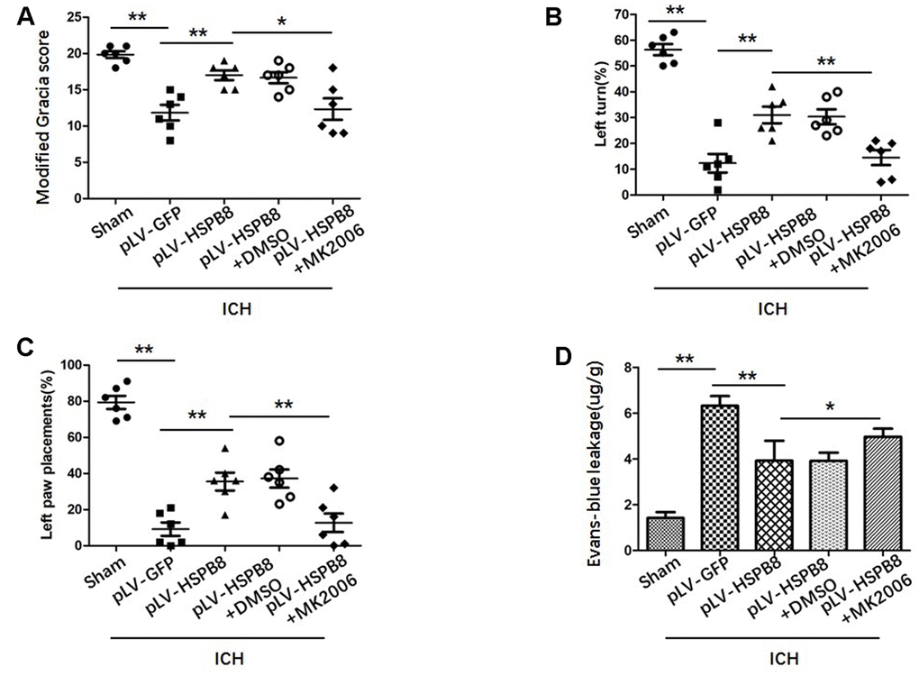 In experiment 3, 60 rats were distributed randomly into five groups:1) sham (n = 12), 2) ICH + pLV-GFP (n = 12), 3) ICH + pLV-HSPB8 (n = 12), 4) ICH + pLV-HSPB8+ DMSO (n = 12), 5) ICH + pLV-HSPB8+ MK2206 (n = 12). 5 μl of the DMSO and MK2206 were infused were applied intracerebroventricularly 30 min before ICH induction in ICH + pLV-HSPB8+ DMSO, ICH + pLV-HSPB8+ MK2206 rats, respectively. Neurobehavior and evans-blue analysis (n = 6), western-blot (n = 6) were used to explore the underlying mechanisms. All animals in our study were decapitated for sample collection under deep anesthesia.